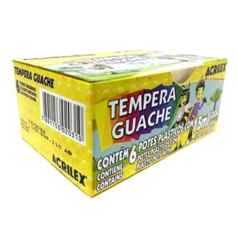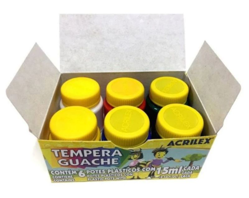 ***AVISO: ESTAMOS TRABALHANDO NORMALMENTE COM TODOS ITENS COM ENVIO IMEDIATO***Tempera Guache 6 Cores AcrilexImportante instrumento para o desenvolvimento da criatividade, coordenação motora e percepção visual das coresPode ser aplicada em papel, papel cartão, cartolina, gesso, madeira, cerâmica e E.V.AIdeal para trabalhos escolaresNão tóxicoCom 6 potes de 15ml cadaCores: Branco, amarelo, vermelho, azul, verde e preto.
