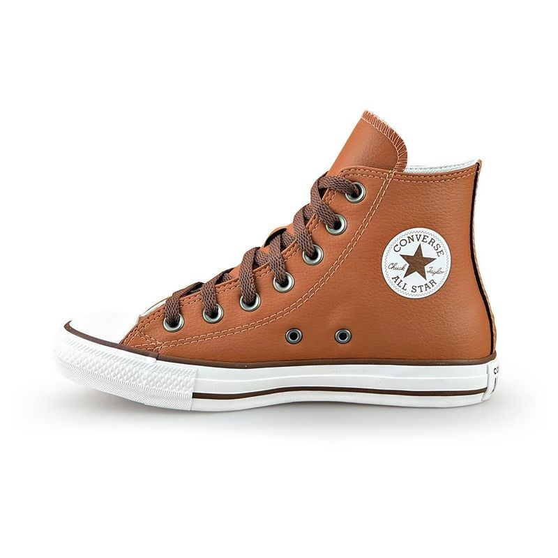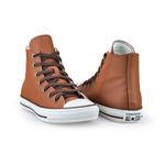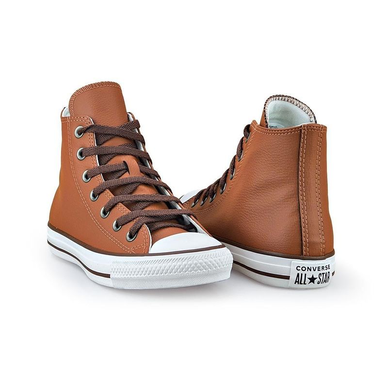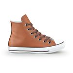 *ATENÇÃO: A CONVERSE ALL STAR TEM A FORMA GRANDE, SUGERIMOS UM NÚMERO MENOR COMPARADO A OUTRAS MARCAS. O modelo de tênis mais tradicional e estiloso da Converse All Star confeccionado em napa sintética na versão botinha, com costuras aparentes e detalhe da vira em marrom. Ilhoses do cadarço na cor dourado envelhecido e cadarço marrom. A logo da marca está na lateral interna do tênis e na parte de trás do solado. Forro em lona de cor clara e palmilha com espuma e EVA. Altura aproximada do solado 3 cm Altura aproximada do cano 11 cm Cabedal em napa sintética Solado emborrachado A quantidade de ilhoses pode variar de acordo com o tamanho do tênis. Garantia: Produto original Converse All Star com garantia de fábrica contra defeitos de fabricação.