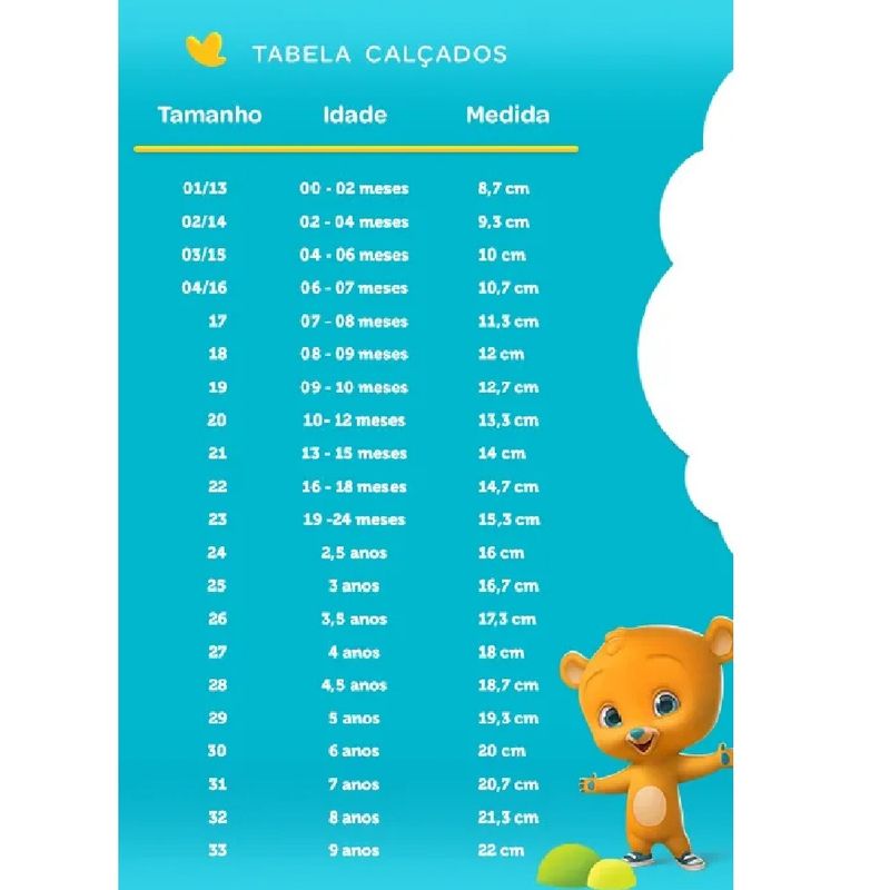 CONFORTO E SEGURANÇA: os calçados são peças essenciais para completar o look, e a escolha do modelo deve levar em consideração o conforto oferecido, a segurança e mobilidade que ele proporciona para os pezinhos em desenvolvimento. Aposte em modelos coloridos e com personagens que fazem a alegria dos pequenos, ou nos básicos essenciais que vão bem com tudo. TOQUE FASHION: Os calçados e acessórios com acabamento metalizado trazem um toque elegante e glamouroso ao visual, e podem ser usados até mesmo nos looks mais básicos, trazendo brilho para a composição! Medidas: 16 a 18 Meses - 22 19 a 24 Meses - 23 2,5 Anos - 24 3 Anos - 25 3,5 Anos - 26