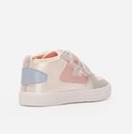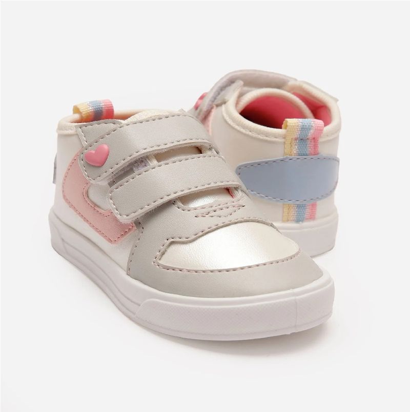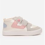 Tênis infantil desenvolvido em material sintético. O modelo casual tem cano alto, bico redondo, cabedal com fechamento por velcro, detalhe de recortes e coraçãozinho em relevo em cores contrastantes, parte interna com palmilha acolchoada, solado emborrachado e macio. Sola com textura que auxilia no caminhar.