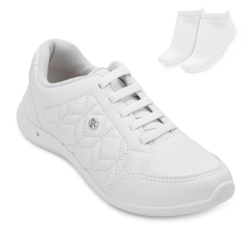 Nome: Tênis Kolosh Casual e Meia KL24-C3185. Gênero: Feminino. Indicado Para: Dia a dia. Estilo da Peça: Casual. Material Externo: Alternativo com costuras em formatos geométricos. Material Interno: Têxtil acolchoado. Detalhe: Aplicação de pin da marca e pedra strass na lateral externa. Fechamento: Cadarço elástico. Palmilha: Forrada e anatômica. Solado: Borracha antiderrapante com Tecnologia Touch +. Tipo de Pisada: Neutra. Peso do Produto: 624 g (o peso varia de acordo com a numeração). Garantia do Fabricante: Contra defeito de fabricação. Origem: Nacional. Código Produto: 02024794. Marca: Kolosh. Acompanha um par de meias tamanho 33 ao 38. Composição: 83 % Algodão. 12 % Poliéster. 05 % Elastodieno.