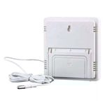 Termômetro Medidor Temperatura Umidade Interno E Externo Com Higrômetro Htc-2a . Termômetro Medidor Temperatura Umidade Interno e Externo com Higrômetro HTC-2A Termo-Higrômetro digital com relógio digital.Indica temperatura e umidade externa e interna.Registra temperatura máxima e mínima.Relógio com opção 12h/24h (não possui despertador).Com furação para pendurar (parafuso não incluso) e suporte para mesa.Tamanho do cabo do sensor externo: 1,5 m Informações importantes:- Escala de Temperatura: 0ºC a 50ºC;- Escala de umidade: 10%RH ~ 99%RH;- Precisão: 0,1ºC; Dimensões aproximadas:- Altura: 10,3 cm;- Largura: 2,4 cm;- Comprimento: 9,3 cm;- Peso: 106 g; Voltagem:- Alimentação: 2 pilhas AAA (palito) 1.5V;Itens inclusos:- 01 Termômetro medidor temperatura umidade;