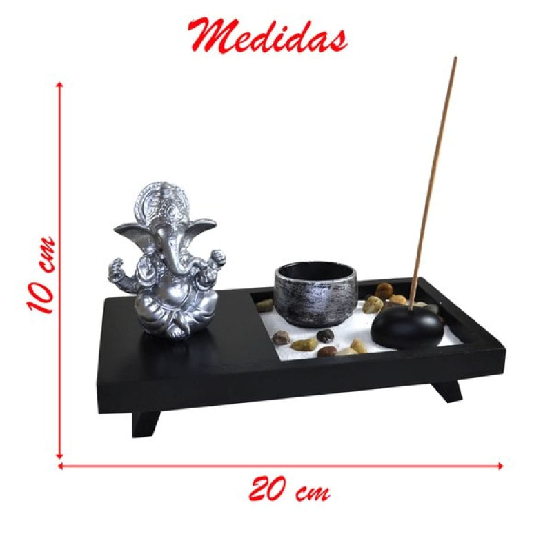 Terrário Bandeja Areia Altar Ganesha Jardim Zen Decorativo Porta Vela Incensário Madeira 10cm - Peça confeccionada em resina de alta qualidade, muito resistente e ótimo acabamento. É ótima para decorar e trazer boas energias para todos e para o ambiente. Esta decoração traz harmonia, paz, prosperidade, sucesso e equilibrio, além de dar um toque elegante para sua casa. Como usar Ganesha na decoração? Ganesha é o deus do intelecto, da sabedoria e da fortuna para a tradição religiosa do hinduísmo e védica. De acordo com a mitologia hindu, Ganesha é o primeiro filho de Shiva e Parvati, e considerado um dos deuses mais importantes desta cultura. Você pode utilizar em qualquer ambiente, seja domésticos ou em espaços profissionais. Sinta-se livre para colocá-lo onde tocar no seu coração. Não esqueça que a posição correta é sempre colocá-lo em algum lugar elevado, como uma estante mais alta, uma coluna, etc. Ele deve ficar em um espaço livre, limpo, sem nenhum objeto que não faça sentido à ele. Características Gerais do Produto: • Material: Resina Garantia: • Garantia contra avarias no transporte