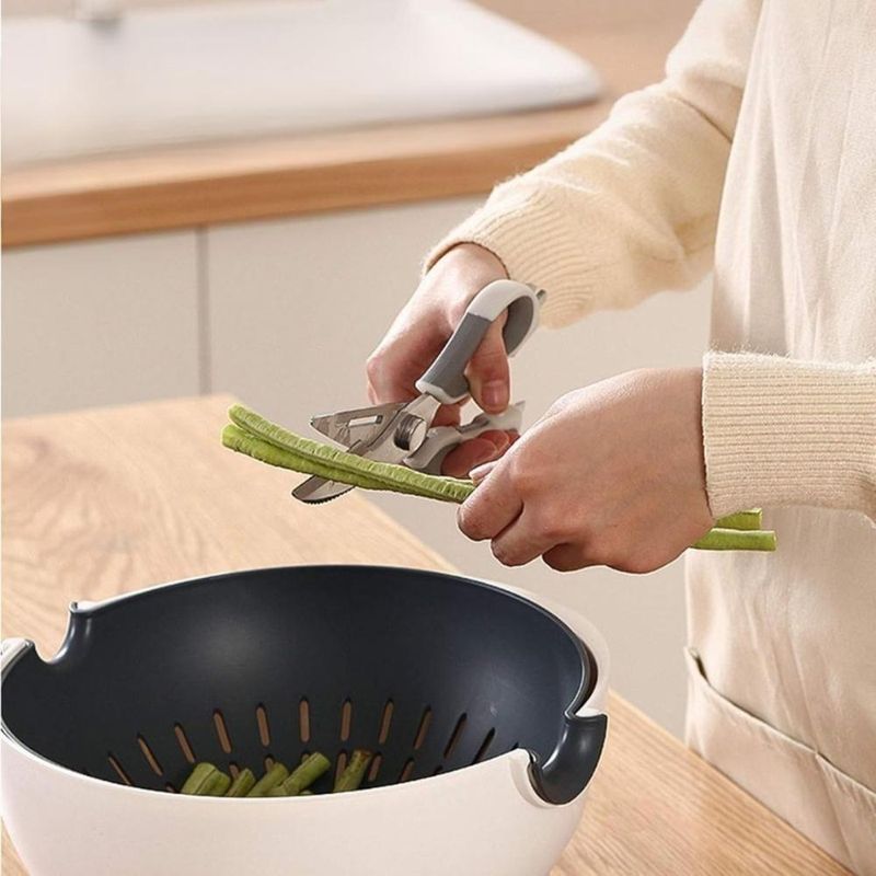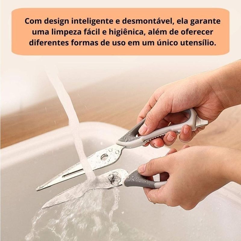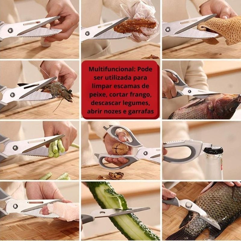 Tesoura Multifuncional Frango Peixe Legumes Abridor GarrafaA Tesoura Multifuncional 3 em 1 foi projetada para tornar as tarefas do dia a dia muito mais simples e rápidas.Com design inteligente e desmontável, ela garante uma limpeza fácil e higiênica, além de oferecer diferentes formas de uso em um único utensílio.Versátil e indispensável, essa tesoura pode ser utilizada para limpar escamas de peixe, cortar frango, descascar legumes, abrir nozes e garrafas e muito mais, substituindo diversos utensílios e otimizando o espaço na sua cozinha.Eficiência, praticidade e design em um só produto, perfeita para quem busca funcionalidade sem abrir mão da qualidade.Material: Aço inox e PolipropilenoMedidas:Altura: 20cmLargura: 8cmPeso: 150gCor: CinzaGarantia: 6 meses Marca: Prana | Material: Aço inox e Polipropileno | Produto: Forma | Tipo da embalagem: Com embalagem | Altura da embalagem: 28 | peso da embalagem: 400 | largura da embalagem: 21 | cor: Cinza