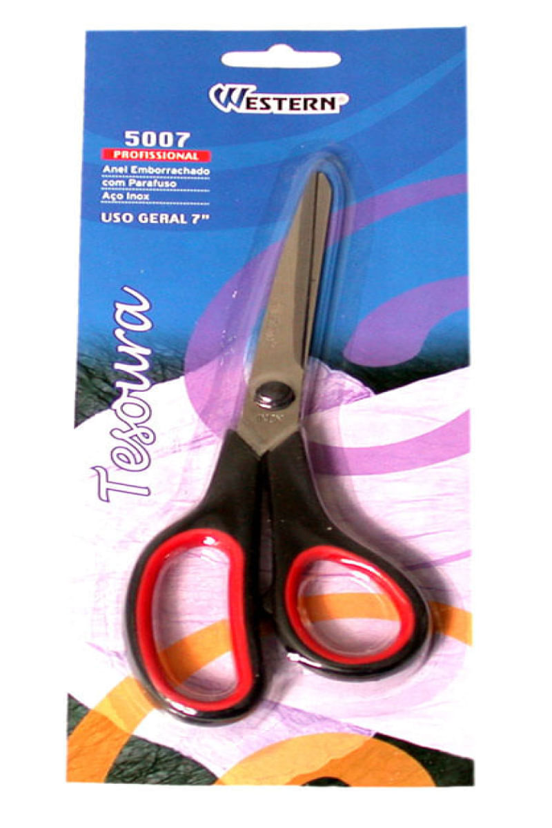 "TESOURA USO GERAL 7"" - Dimensões da Peça: 19,5 x 7,5 x 1,2cm - Dimensões da Embalagem: 10,5 x 1,5 x 27cm - Quantidade Inner: 60 Peças - Dimensões Inner: 41,5 x 27,5 x 14cm - Quantidade Master: 120 Peças - Dimensões Master: 43,5 x 30 x 30cm - Material: Aço inox e PP - Cor: Cabo Preto com Vermeho e Preto com Azul - Tipo de Embalagem: Blister - Marca: Western - Origem: China - Contém: 1 unidade - Anel Emborrachado - Com Parafuso - CUIDADOS: - Produto cortante. Tenha cuidado ao manusear. - Guarde em local seco e fresco, longe de umidade. - Guarde em local seguro. - Mantenha fora do alcance de crianças. - Observação: Este item é comercializado em cores sortidas: Preto com Vermeho e Preto com Azul. O Mix de cores é variável e na entrega você pode receber 1 ou 2 cores.Garantia do produto: 90 dias de garantia de acordo com o Código de Defesa do Consumidor + a Garantia do Fabricante"