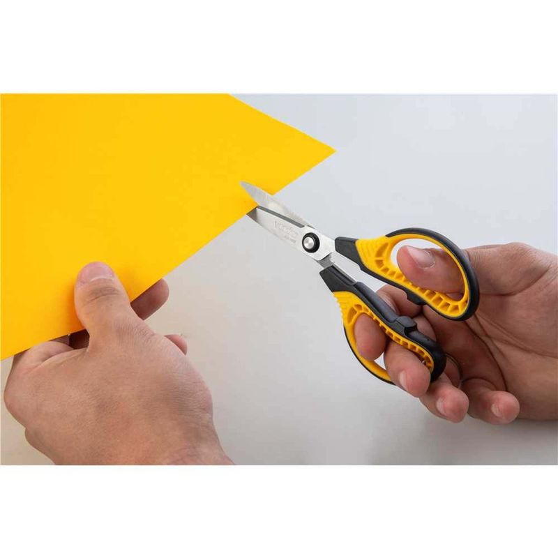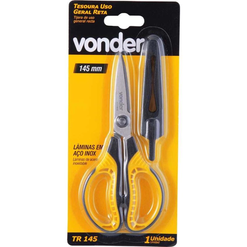 Tesoura uso Geral Reta, com Cabo Plástico com Revestimento Emborrachado, TR 145, Vonder OstenVonder - Conteúdo da embalagem: 1 tesoura. Aplicação: Indicada para cortes em geral. Destaques: Possui lâminas em aço inox que proporcionam maior durabilidade, além do cabo emborrachado, que garante uma melhor ergonomia. Garantia - E (CDC): Garantia legal: 90 dias Referência: 3085575145 Material do cabo: Plástico com revestimento emborrachado Comprimento total: 145 mm Massa aproximada (peso): 0,042 kg Comprimento da lâmina: 50 mm Material da lâmina: Aço inox baixo carbono (2Cr13) Destaques Comercial: Possui lâminas em aço inox que proporcionam maior durabilidade, além do cabo emborrachado, que garante uma melhor ergonomia. Aplicação Comercial: Indicada para cortes em geral. Características Gerais do Produto: Garantia: • 3 Meses