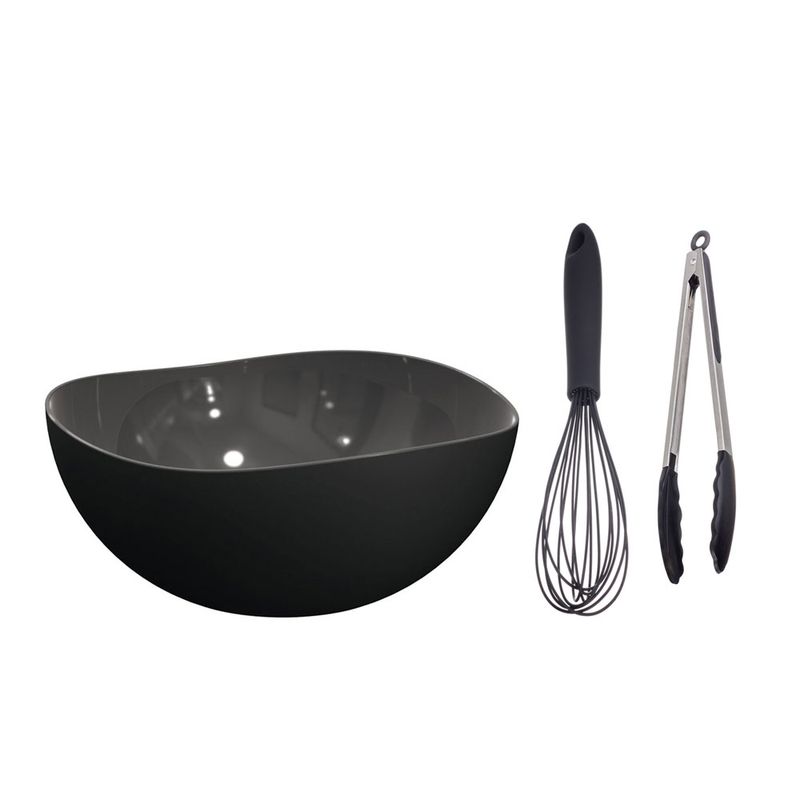 Kit de travessa bowl, batedor de claras e pegador de salada. A travessa da UZ além de design arrojado, possuem superfície interna lisa que facilita a lavagem. São fabricados em material altamente resistente. Alta transparência, material 100% reciclável e atóxico. Todos os produtos fabricados pela UZ Utilidades são livres de Bisfenol A (BPA). Os produtos fabricados em Polipropileno (PP) podem ser levados ao micro-ondas e freezer. Acompanha batedor manual de claras e pegador com haste de inox e silicone injetado preto. Desenvolvido com silicone altamente resistente, suportando até 240°C, atóxico e resiste a mudança de temperatura sem deformar e aquecer. Não absorve líquidos, resíduos ou cheiro, são higiênicos e fáceis de lavar. Uma solução prática e moderna, que traz toda funcionalidade sem danificar e desprender substâncias do fundo das panelas ou recipientes. Contêm: 1 Travessa de 2 litros - 10,4 x 24,8 x 24,8 cm 1 Batedor Fouet - 6 x 7 x 31 cm 1 Pegador de Salada - 27 x 4 cm