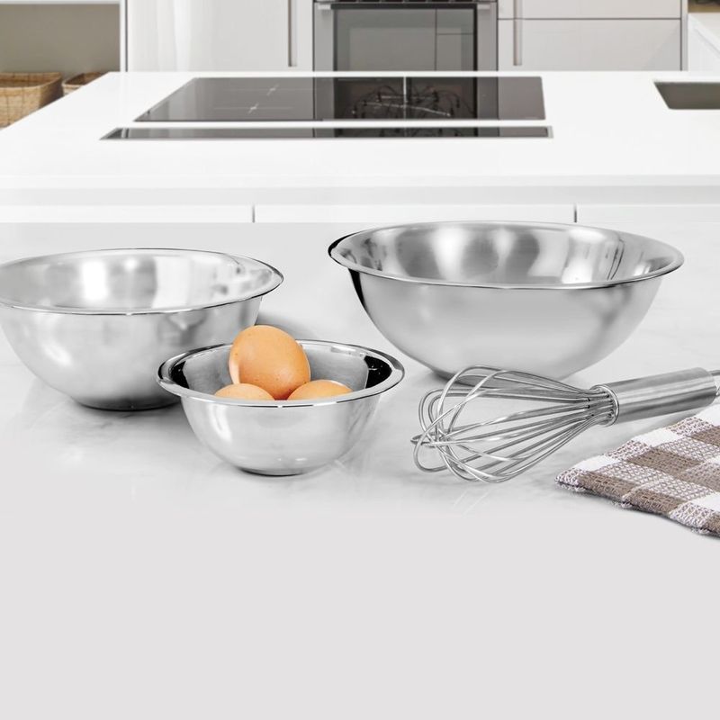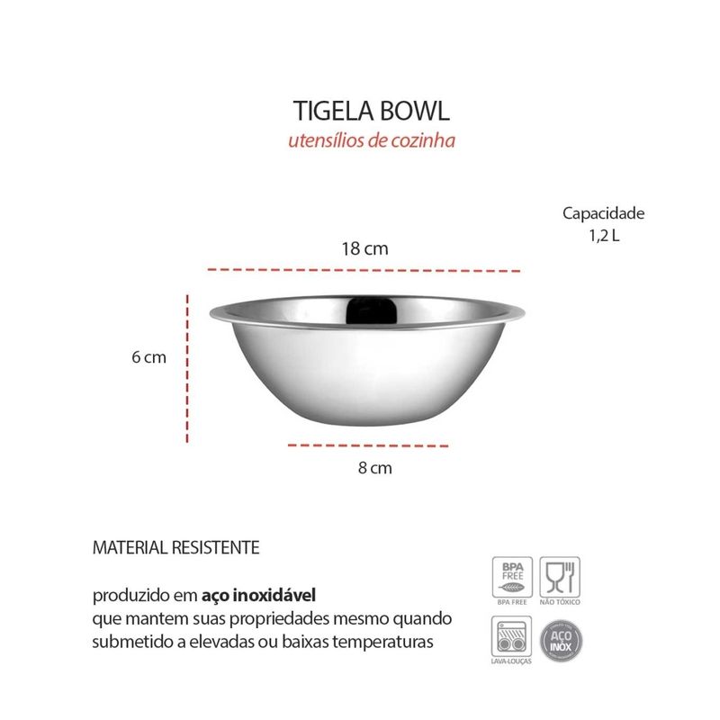 A tigela bowl em aço inoxidavel é versatil e resistente, ideal para preparar, misturar e servir alimentos com praticidade. Produzida em aço inoxidavel, oferece alta durabilidade, resistencia à corrosao e facil limpeza, sendo perfeita para o uso diario na cozinha. Seu design funcional permite utilizar tanto no preparo de receitas quanto para servir saladas, massas, frutas e diversos outros alimentos. Contem: 1 Tigela Bowl Medidas: 18 x 6 cm Capacidade: 1,2 L Material: Aço inoxidavel