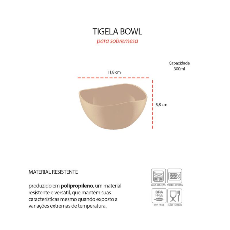 Tigela bowl, conhecido tambem como cremeira. Os potes possuem superficie interna lisa que facilita a lavagem. As tigelas sao produzidas em material altamente resistente e reciclavel. E os bowls produzidos em Polipropileno sao livres de Bisfenol A (BPA Free) e podem ser levados ao microondas e freezer. Contem: 1 Tigela de Sobremesa Capacidade: 300 ml Medidas: 5,8 x 11,8 cm Material: Polipropileno