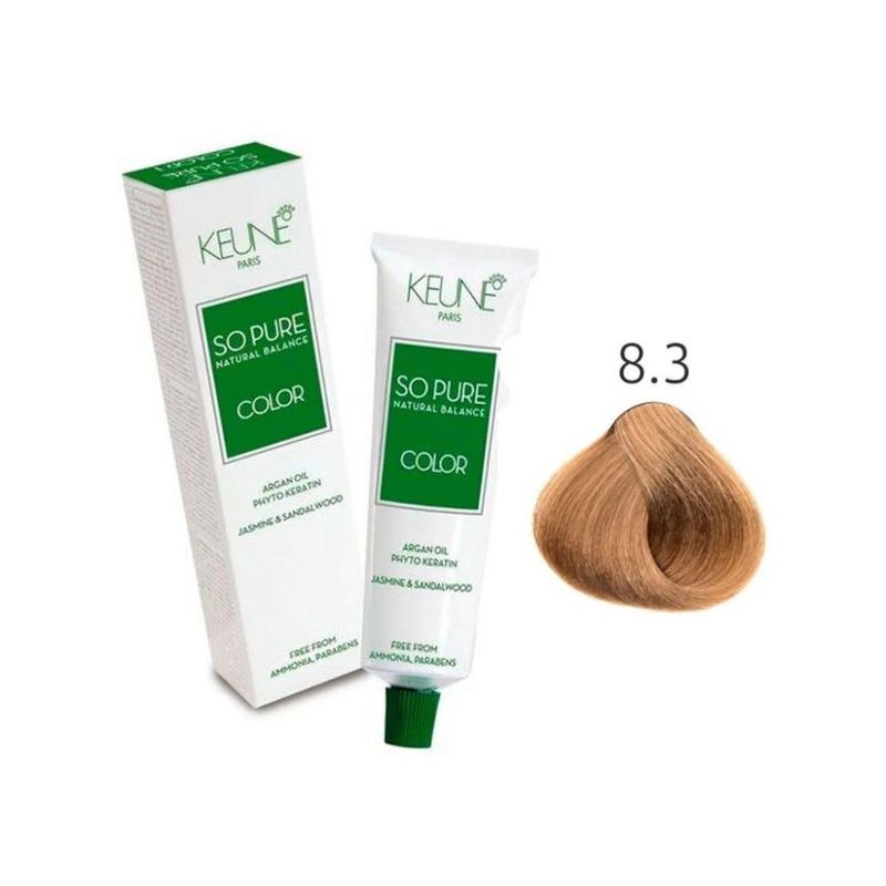 Tinta So Pure Color Keune 8.3 Louro Claro Dourado 60mlTinta So Pure Color Keune 8.3 Louro Claro Dourado inspirou-se na natureza e usou muita tecnologia para criar uma linha que colore de forma suave e poderosa. A So Pure Color uma coloração permanente que cobre até 100% dos fios brancos, é totalmente livre de amônia e de PPD Parafenilenodiamina (grande causador de alergias) apresentando baixa incidência de reações alérgicas, possui ingredientes altamente condicionantes como fitoqueratina, óleo de argan e extratos 100% naturais.Sua composição é enriquecida com ingredientes cuidadosamente selecionados como:Fitoqueratina: Queratina extraída de plantas que fortalece e dá brilho ao cabelo.Extrato de Coco: Condiciona o fio e evita manchas no couro cabeludo e pele após a coloração.Óleo de Argan: Alta hidratação e força aos fios e proteção contra agentes externos.Jasmim: Hidrata os fios e evita a oxidação e o desbotamento da cor.Sândalo: Auxilia no equilíbrio de couro cabeludo seco e oleoso.Possui uma textura perolizada inconfundível, com uma cartela de cor extremamente fiel e uma experiência aromática indescritível.