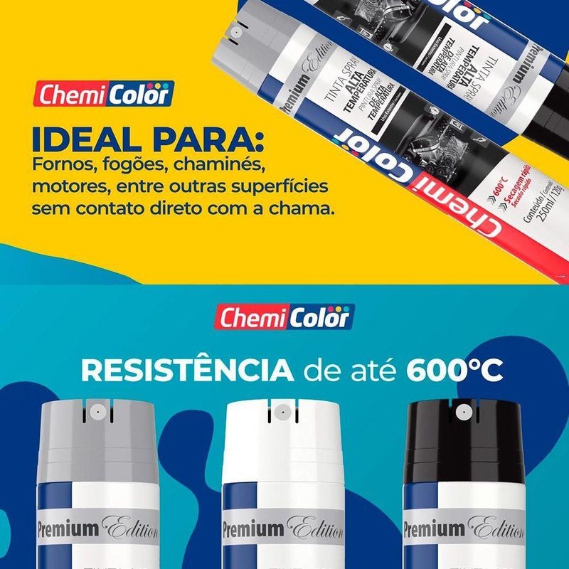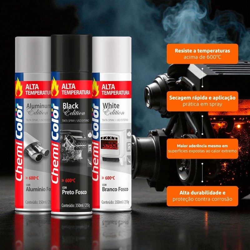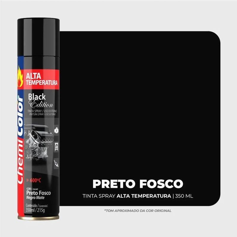 Tinta Spray 350ml Alta Temperatura Interno E Externo Secagem Rápida - Chemicolor Cor Preto FoscoIdeal para quem busca uma tinta spray de alta performance, a Chemicolor Alta Temperatura suporta até 600°C, perfeita para aplicações em superfícies que sofrem com calor extremo, como escapamentos, motores, churrasqueiras e equipamentos industriais. Sua fórmula de secagem rápida garante praticidade e acabamento fosco de alta durabilidade, disponível nas cores Alumínio Fosco e Preto Fosco.Principais benefícios:- Resiste a temperaturas elevadas até 600°C- Uso interno e externo com alta aderência- Secagem rápida para aplicação eficiente- Acabamento fosco elegante e resistente- Ideal para superfícies metálicas e de alta temperaturaConfie na Chemicolor para proteger e valorizar superfícies expostas ao calor intenso, com qualidade comprovada e resultado profissional. Estoque limitado para quem não abre mão de durabilidade e performance.Especificações:Conteúdo: 350mlPeso Líquido: 215gConteúdo da Embalagem:1 Tinta SprayGarantia:90 diasImportante:- Imagens meramente ilustrativas. Os objetos decorativos e demais itens que aparecem nas fotos não acompanham o produto.- Ao receber a mercadoria verifique a condição da embalagem, caso apresente violação ou esteja danificada não assine o comprovante de entrega.- Garantia condicionada ao uso correto. O uso indevido do produto, em desacordo com o manual ou com as instruções do fabricante, poderá anular a garantia.