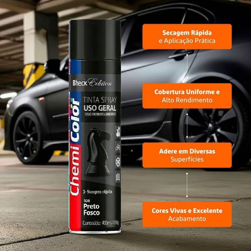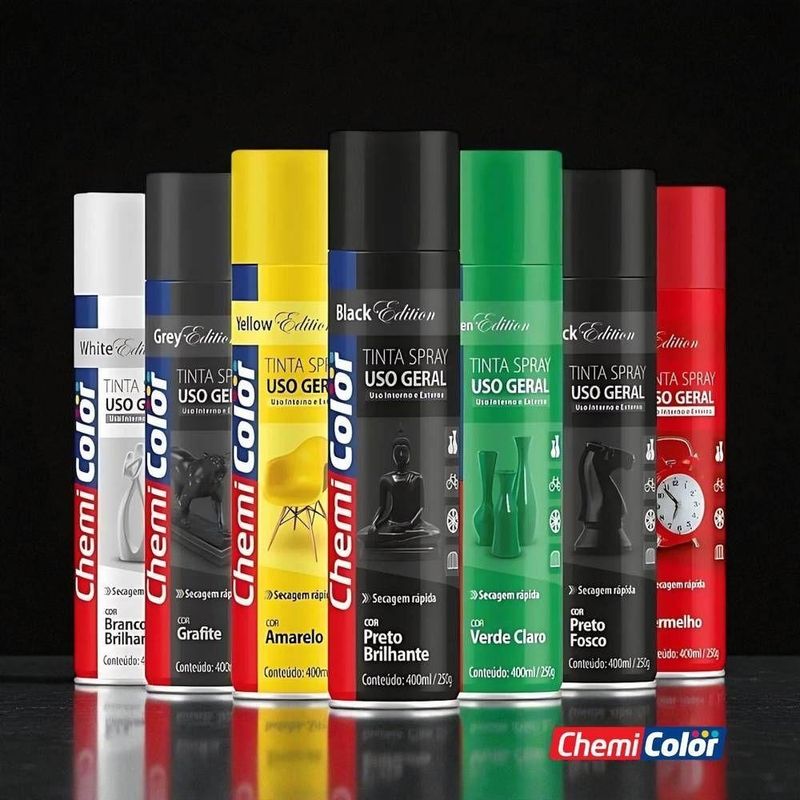 Tinta Spray 400ml Para Uso Geral Multiuso Secagem Rápida - Chemicolor Cor Preto FoscoA Tinta Spray Uso Geral Chemicolor 400ml é a solução prática e versátil para quem busca renovar, decorar ou proteger superfícies com rapidez e excelente acabamento. Produzida com componentes de alta qualidade, oferece cobertura uniforme, secagem eficiente e alto rendimento, ideal para projetos em ambientes internos ou externos. Indicada para uso geral, apresenta ótimo desempenho quando aplicada após o preparo adequado da superfície. Sua fórmula adere com facilidade em materiais como metais, cerâmica, gesso, madeira e vime, garantindo resultados consistentes e duradouros. Disponível em diversas cores, permite criar efeitos decorativos modernos, vibrantes e bem definidos. Com frasco de 400ml, proporciona aplicação prática em jato contínuo, permitindo maior controle durante a pintura e acabamento limpo em poucas camadas. Uma escolha versátil para artesanato, manutenção, hobbies e pequenos reparos.Vantagens da tinta spray- Cobertura uniforme com excelente secagem- Diversas cores para acabamentos decorativos- Aplicação fácil em diferentes superfíciesRenove seus projetos com praticidade e estilo. Adicione ao carrinho e aproveite o desempenho ChemicolorEspecificações:Conteúdo: 400mlPeso Líquido: 335gConteúdo da Embalagem:1 Tinta SprayGarantia:90 diasImportante:- Imagens meramente ilustrativas. Os objetos decorativos e demais itens que aparecem nas fotos não acompanham o produto.- Ao receber a mercadoria verifique a condição da embalagem, caso apresente violação ou esteja danificada não assine o comprovante de entrega.- Garantia condicionada ao uso correto. O uso indevido do produto, em desacordo com o manual ou com as instruções do fabricante, poderá anular a garantia.