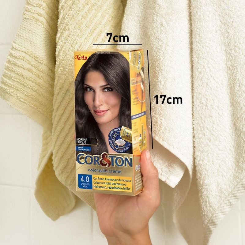 Tintura Creme Cor&Ton 4.0 Castanho MédioCom a Tintura Creme Cor&Ton 4.0 Castanho Médio, você realça a cor natural do seu cabelo, cobre os cabelos brancos, clarea ou escurecer os cabelos. Tintura Creme Cor&Ton 4.0 Castanho Médio proporciona aos cabelos cores vivas, luminosas e duradouras com hidratação, sedosidade e brilho. Sua formulação com queratina, gérmen de trigo, silicone e filtro UV que garantem cabelos fortes, nutridos e com máxima proteção. Com textura cremosa, facilita a distribuição nos fios, fazendo com que os pigmentos sejam facilmente absorvidos. Uma coloração permanente com fórmula de altíssima qualidade.