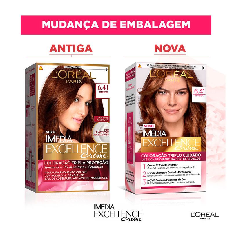 Tintura Imedia Excellence 6.41 MarromA Tintura Imédia Excellence 6.41 Marrom oferece coloração com triplo cuidado: cuida da cor, do couro cabeludo e cobertura completa dos fios brancos. Sua composição com Ionene G, Pro-Keratina e Ceramida garante força,restauração, hidratação intensa e uma cor incrível aos fios, com cores radiantes e modernas para você arrasar! Imagem meramente ilustrativa. A embalagem está sendo atualizada pelo fabricante. Você poderá receber a embalagem antiga ou nova.