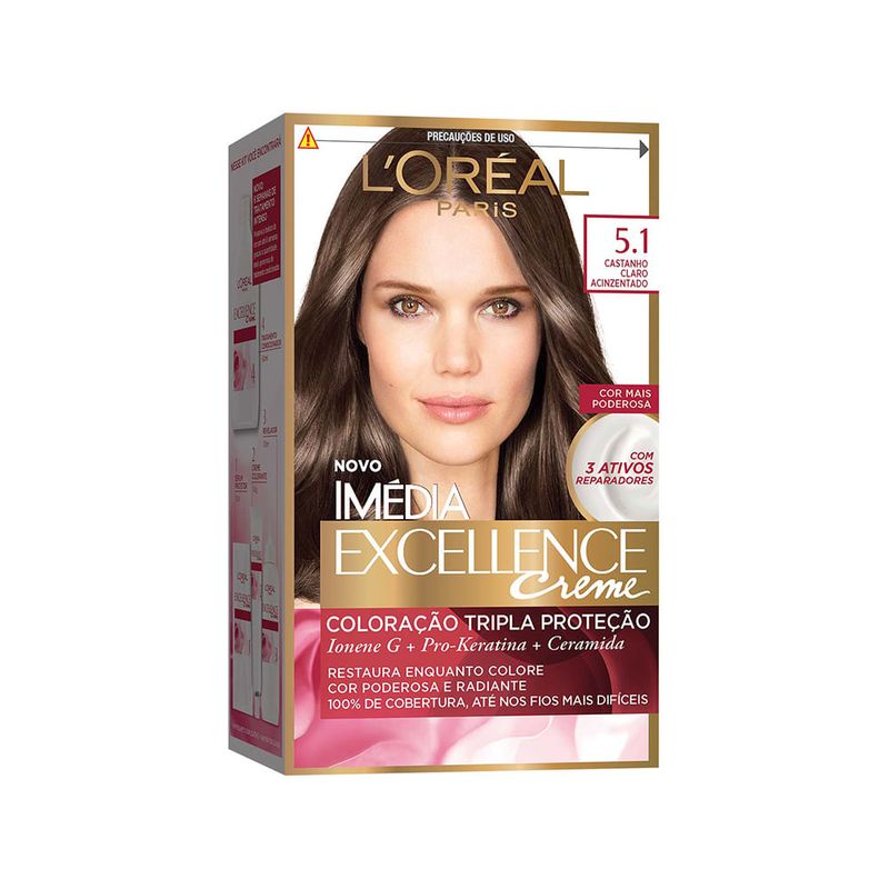 Tintura Imédia Exellence 5.1 Castanho Claro AcinzentadoA Tintura Imedia Exellence 5.1 Castanho Claro Acinzentado oferece coloração com triplo cuidado: cuida da cor, do couro cabeludo e cobertura completa dos fios brancos. Sua composição com Ionene G, Pro-Keratina e Ceramida garante força,restauração, hidratação intensa e uma cor incrível aos fios, com cores radiantes e modernas para você arrasar!
