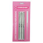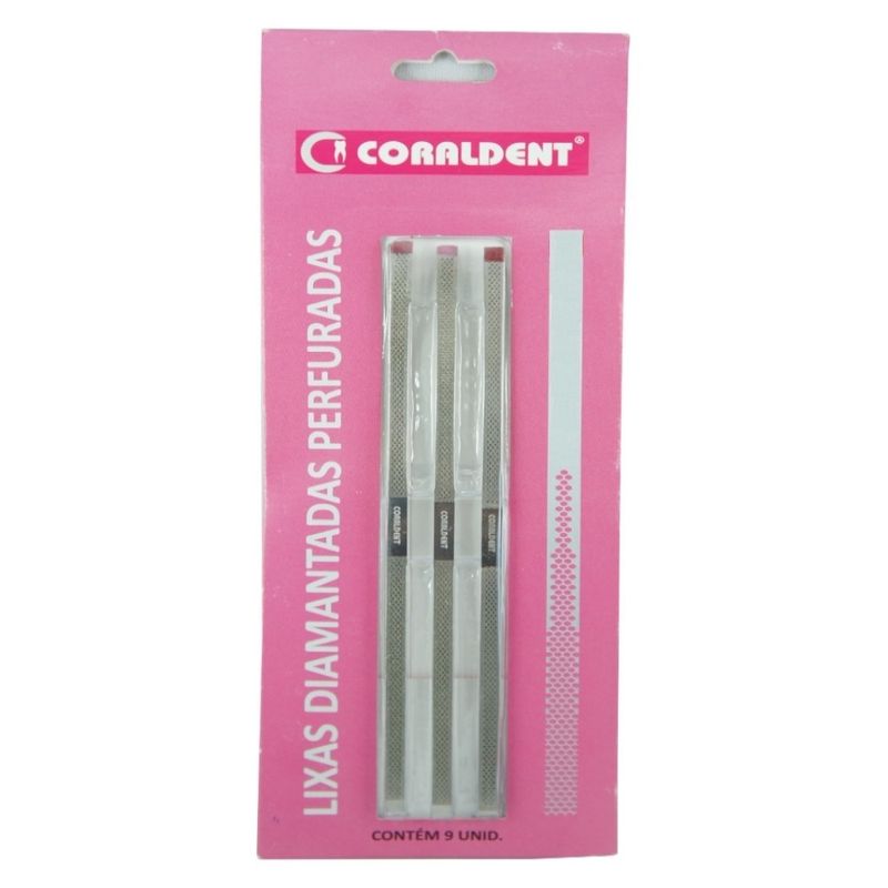 Apresentação ► Embalagem com 9 unidades ( 3 médias, 3 finas e 3 extra finas). Características ► Fabricado em aço inoxidável , perfurada e diamantada; ► Autoclavável; ► Dimensões: 4 x 160 x 0,05 mm; ► Granulação : Sortida ( 3 médias, 3 finas e 3 extra finas). Indicações ► As Lixas Diamantadas Perfuradas Coraldent atuam no desgaste dos espaços interproximais, acabamentos em superfícies dentais e ou materiais restauradores. Perfuradas e diamantadas, elas são mais eficientes no desgaste: o resíduo dental não se acumula na superfície, garantindo maior aproveitamento do material abrasivo e maior durabilidade após uso.