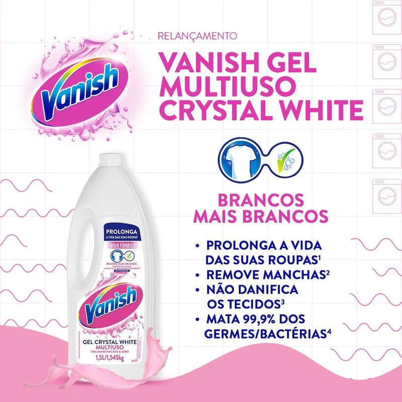 Tira Manchas Vanish Líquido Crystal White para roupas brancas 1,5LDescrição do ProdutoO Tira Manchas Vanish Líquido Crystal White é a solução perfeita para manter suas roupas brancas impecáveis. Mais eficaz que o cloro, este produto remove manchas¹ de forma eficiente, sem comprometer a integridade dos tecidos. Além disso, ajuda a prolongar a vida útil das suas roupas, garantindo que elas permaneçam com aparência de novas por mais tempo.BenefíciosEficácia Superior: Remove manchas¹ melhor que o cloro.Proteção dos Tecidos: Não danifica os tecidos, mesmo os mais delicados.Prolonga a Vida das Roupas: Mantém as roupas brancas e conservadas.Higienização Completa: Elimina 99,9% dos germes e bactérias.Versatilidade: Ideal para tecidos delicados como lã e seda.