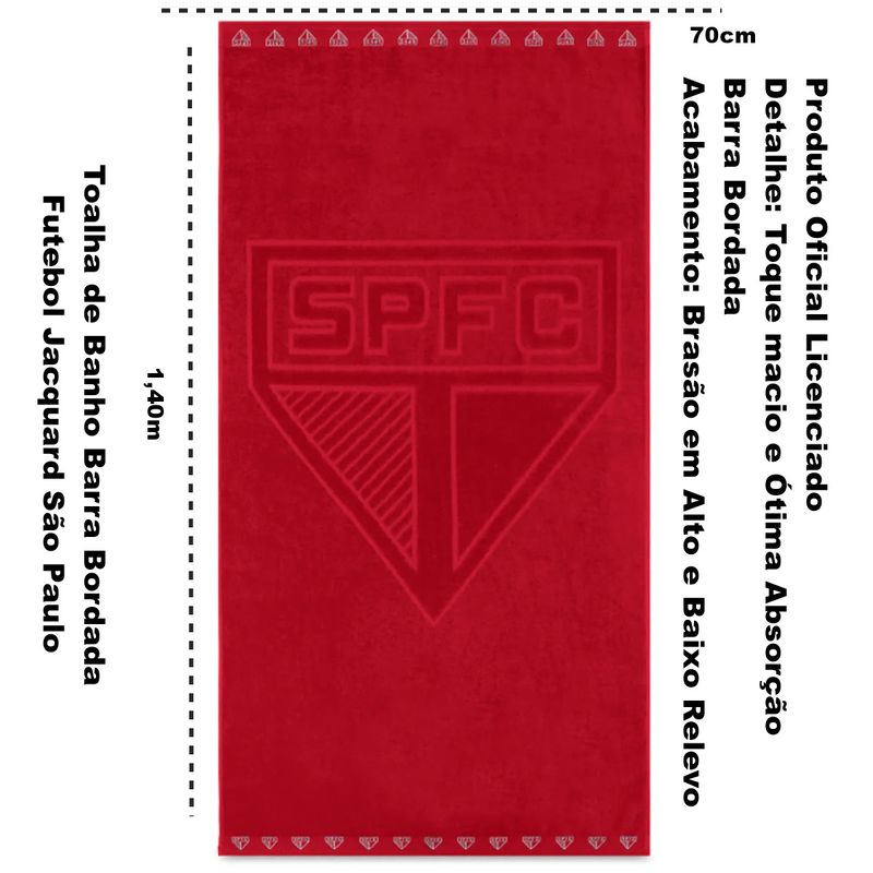 Um item indispensável para o torcedor apaixonado pelo São Paulo. Com o desenho do brasão do clube em alto e baixo-relevo e uma linda barra bordada, a toalha de futebol Buettner é ideal para a praia, lazer ao ar livre ou mesmo para uso diário em casa. A toalha é também uma excelente opção de presente para aquele torcedor apaixonado pelo clube. Produto Oficial Licenciado. Produto com a qualidade Buettner, de geração em geração, a marca de Cama, Mesa e Banho mais querida do Brasil.Toalha de Banho Buettner Jacquard Veludo 100% Algodão Futebol Sao Paulo 70cmx140m Vermelho Todas as informações divulgadas são de responsabilidade do fabricante/fornecedor.Marca: BuettnerClassificação: BanhoTecido: Copo em Alto e Baixo Relevo Veludo - Verso FelpudoComposição Fios: 100% AlgodãoGramatura: 440g/m2Conteúdo e Medidas: Toalha de Banho Jacquard Veludo Futebol - Sao Paulo - 01 PeçaTamanho (0,70cm x 1,40m)Coleção / Sortimento: Linha Licenciados FutebolProduto Oficial e Licenciado por Bouton Veludo: de um lado Outro FelpudoCor: VermelhoAcabamento: Brasão em Alto e Baixo RelevoBarra BordadaDetalhe: Toque macio e Ótima AbsorçãoProduto Oficial LicenciadoFabricante: BoutonReferencia: 41074Código de Barra: 7892409410749Garantia (Fabricante): Contra Defeitos de Fabricação.Imagem Meramente IlustrativaINFORMAÇÕES IMPORTANTES: Item composto apenas por 01 Toalha de Banho, os demais itens são meramente decorativos e NÃO fazem parte do conteúdo da embalagem. Aviso : - Todas as medidas são valores aproximados e podem sofrer alguma variação.- As cores podem sofrer uma pequena variação, dependendo do lote do produto e das configurações do seu computador.