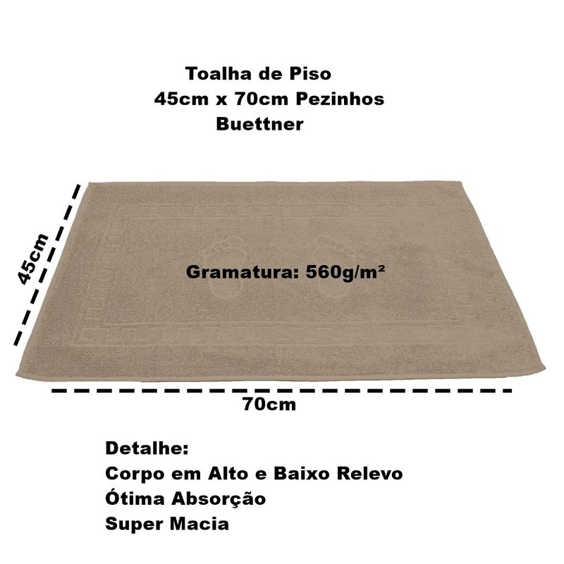 Prática e divertida, a Toalha de Piso Pezinhos Buettner é uma maneira criativa de enfeitar o seu banheiro. Produzida em 100% algodão, ela possui contornos de mosaicos em alto e baixo relevo além dos já tradicionais desenhos dos pezinhos.Toalha Piso Buettner Felpudo 100% Algodão Pezinhos 45cmx70cm KhakiTodas as informações divulgadas são de responsabilidade do fabricante/fornecedor.Marca: Buettner e BoutonClassificação: PisoTecido: FelpudoComposição (Fios): 100% AlgodãoGramatura: 560g/m2Conteúdo e Medidas: Toalha Piso Felpudo Pezinhos - 01 PeçaTamanho (45cm x 70cm)Detalhe:Corpo em Alto e Baixo RelevoÓtima AbsorçãoSuper Macia?Produto Licenciado por BoutonColeção / Sortimento: Linha PezinhosCor: KhakiFabricante: BoutonReferencia: 61859Código de Barra: 7892409618596Garantia(Fabricante): Contra Defeito de FabricaçãoImagens Meramente IlustrativasINFORMAÇÕES IMPORTANTES: Item composto apenas por 01 Piso, os demais itens são meramente decorativos e NÃO fazem parte do conteúdo da embalagem.Aviso : - Todas as medidas são valores aproximados e podem sofrer alguma variação.- As cores podem sofrer uma pequena variação, dependendo do lote do produto e das configurações do seu computador.