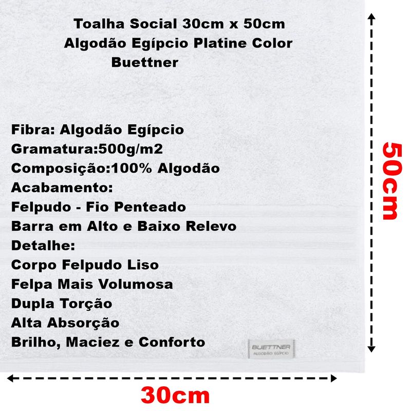 Toalha Social (Lavabo) felpuda, 100% Algodão Egípcio no tamanho 30cm x 50cm com 500g/m² da linha Nobre e da marca Bouton, modelo Platine, produzida em teares especiais que possibilitam desenvolver desenhos tanto no corpo quanto nas barras das toalhas. A toalha Platine possui corpo liso com bastante felpa e uma barra discreta e suave com linhas horizontais, apenas para dar um charme ao expor ela. Seu corpo liso possui alta absorção, e sua barra minimalista possui detalhes horizontais, destacando um tom de charme e nobreza, proporcionando uma linda exposição no banheiro, traduzindo refinamento e muita sofisticação ao ambiente. Suas cores buscam remeter aos tons nobres da estação.Toalha Social Buettner Platine Algodão Egípcio Color 30x50cm BrancoTodas as informações divulgadas são de responsabilidade do fabricante/fornecedor.Marca: Buettner e BoutonClassificação: Social - LavaboTecido: FelpudoComposição (Fios): 100% Algodão Egipcio Gramatura: 500 g/m2Conteúdo e Medidas: Toalha Social Platine Algodão Egípcio Color - 01 unidadeTamanho(30cm x 50cm)Produto Licenciado por BoutonColeção / Sortimento: Linha PlatineCor: BrancoFabricante: BoutonReferencia: 45424Código de Barra: 7892409454248Garantia(Fabricante): Contra Defeito de FabricaçãoImagens Meramente IlustrativasINFORMAÇÕES IMPORTANTES: Item composto apenas por 01 Toalha social, os demais itens são meramente decorativos e NÃO fazem parte do conteúdo da embalagem.Aviso : - Todas as medidas são valores aproximados e podem sofrer alguma variação.Atenção: Devido a variação de modelos de monitores, as cores podem variar com a cor real do produto no seu computador.