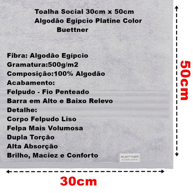 Toalha Social (Lavabo) felpuda, 100% Algodão Egípcio no tamanho 30cm x 50cm com 500g/m² da linha Nobre e da marca Bouton, modelo Platine, produzida em teares especiais que possibilitam desenvolver desenhos tanto no corpo quanto nas barras das toalhas. A toalha Platine possui corpo liso com bastante felpa e uma barra discreta e suave com linhas horizontais, apenas para dar um charme ao expor ela. Seu corpo liso possui alta absorção, e sua barra minimalista possui detalhes horizontais, destacando um tom de charme e nobreza, proporcionando uma linda exposição no banheiro, traduzindo refinamento e muita sofisticação ao ambiente. Suas cores buscam remeter aos tons nobres da estação.Toalha Social Buettner Platine Algodão Egípcio Color 30x50cm PrataTodas as informações divulgadas são de responsabilidade do fabricante/fornecedor.Marca: Buettner e BoutonClassificação: Social - LavaboTecido: FelpudoComposição (Fios): 100% Algodão Egipcio Gramatura: 500 g/m2Conteúdo e Medidas: Toalha Social Platine Algodão Egípcio Color - 01 unidadeTamanho(30cm x 50cm)Produto Licenciado por BoutonColeção / Sortimento: Linha PlatineCor: PrataFabricante: BoutonReferencia: 37237Código de Barra: 7892409372375Garantia(Fabricante): Contra Defeito de FabricaçãoImagens Meramente IlustrativasINFORMAÇÕES IMPORTANTES: Item composto apenas por 01 Toalha social, os demais itens são meramente decorativos e NÃO fazem parte do conteúdo da embalagem.Aviso : - Todas as medidas são valores aproximados e podem sofrer alguma variação.Atenção: Devido a variação de modelos de monitores, as cores podem variar com a cor real do produto no seu computador.