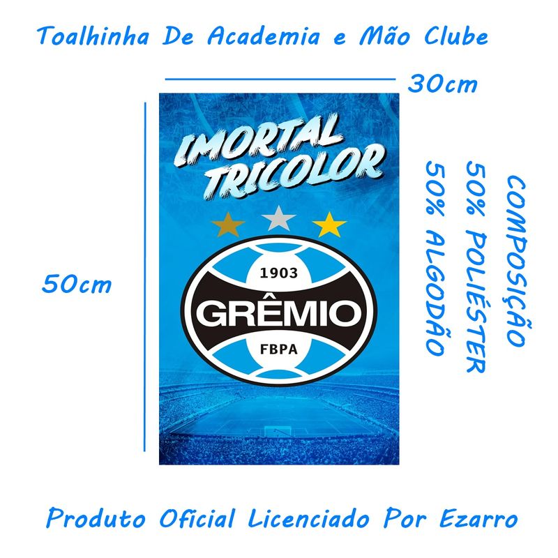 A toalha oficial do clube de futebol brasileiro produzida pela Ezarro através de licenciamento da marca do seu clube do coração.Confeccionado em 50% Algodão e 50% Poliéster, a Toalha de Academia ou Mão licenciada da Ezarro é exclusivo e limitado, escolha seu time do coração e aproveite!Toalhinha Social De Academia e Mão KazzaVip Felpa 50% Algodão e 50% Poliéster Estampada Oficial Licenciada Gremio 30cmx50cm AzulTodas as informações divulgadas são de responsabilidade do fabricante/fornecedor.Marca: EzarroClassificação: Toalhinha Social De Academia e MãoTecido: FelpaComposição (Fios: 50% Algodão e 50% PoliésterConteúdo e Medidas: Toalhinha Social De Academia e Mão Estampada Oficial Licenciada - Gremio - 01 PeçaTamanho Aproximado: (0,30cm x 0,50cm)O Algodão Fica na Parte de Trás Onde tem a Felpa e Poliéster na Frente para fazer a Estampa.Secagem rápidaCores vibrantes que não desbotam com facilidadeProduto leve, prático e fácil de transportarProduto Licenciado e Distribuido por EzarroColeção / Sortimento: Linha SocialEstampada: SimFabricante: EzarroReferencia: 094Código de Barra: 7898970224495Garantia (Fabricante): Contra Defeitos de Fabricação.Imagem Meramente IlustrativaINFORMAÇÕES IMPORTANTES: Item composto apenas por 01 Toalhinha Social , os demais itens são meramente decorativos e NÃO fazem parte do conteúdo da embalagem.Aviso : - Todas as medidas são valores aproximados e podem sofrer alguma variação.- As cores podem sofrer uma pequena variação, dependendo do lote do produto e das configurações do seu computador.