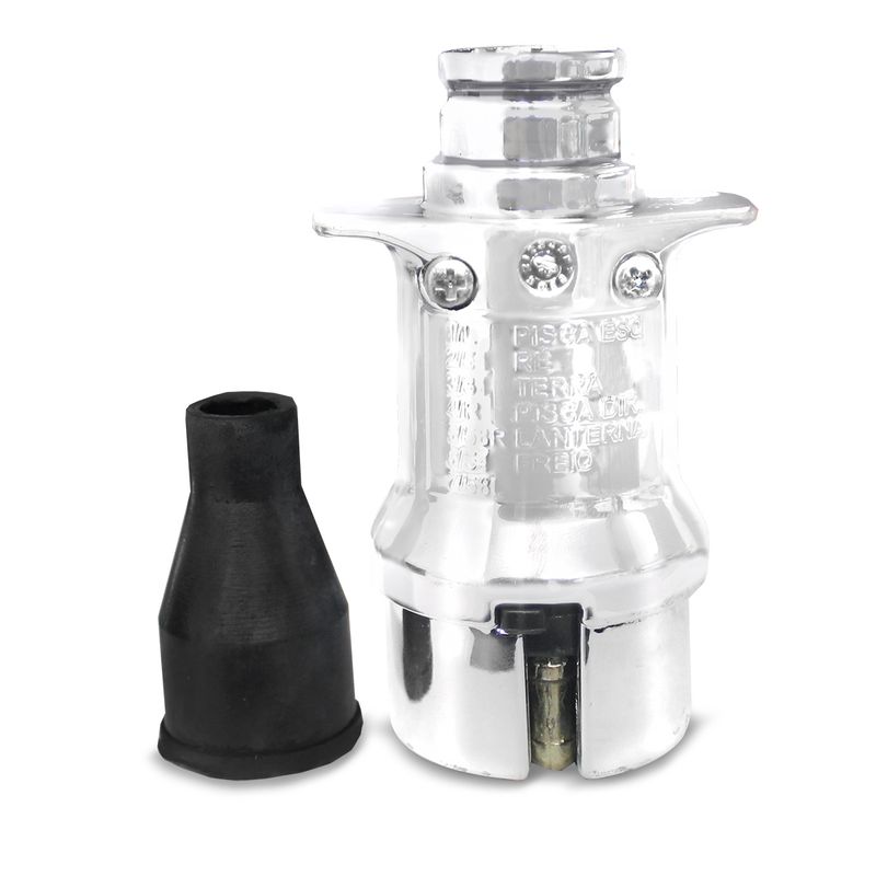 Plug para Tomada de Engate Reboque Macho 7 Polos Alumínio Cromado Pingo Com o uso continuo de reboques, ao engatar ou desengatar, o pluga da tomada do engate pode ser danificada e assim impedir a passagem de sinais elétricos para identificação da sinalização do veículo. Pensando nisso a Pingo desenvolveu uma Plug de Tomada Alumínio na Cor Preto. Desenvolvido especialmente para fazer a correta ligação da fiação do engate afim de evitar multas e acidentes mantendo o reboque com a mesma sinalização do veículo. Além de acrescentar mais beleza ao seu engate, e trazer mais praticidade ao motorista, é uma excelente peça de reposição Fabricado em Alumínio, na cor cromado, sendo um material já conhecido pela sua excelente qualidade e resistência, para que não traga transtorno algum ao motorista enquanto utiliza o produto, sendo resistente a chuva e a raios U.V. Contém 7 pólos porém acompanha somente 6 terminais para ligação modelo padrão, de fácil instalação, preserva a originalidade do seu veículo, pois não há necessidade de novas furações ou quaisquer adaptações. Homologado pelo inmetro RFE n°057 e regularizado de acordo com a resolução n°197 do contran. Especificações Técnicas: Regularizado de acordo com resolução n°197 do Contran Pintura eletrostática Cromada Fabricado em Alumínio Pluga da Tomada de engate cromada Conector Macho Plug de tomada 7 Polos Dimensões e peso da embalagem: Altura: 11 cm Largura: 17 cm Comprimento: 17 cm Peso aproximado: 560 g Tabela de Aplicação: Compatível com todas as versões. Informações Adicionais: A instalação deve ser realizada por um profissional especializado, pois a General Car não se responsabiliza pelo uso incorreto ou instalação inadequada.