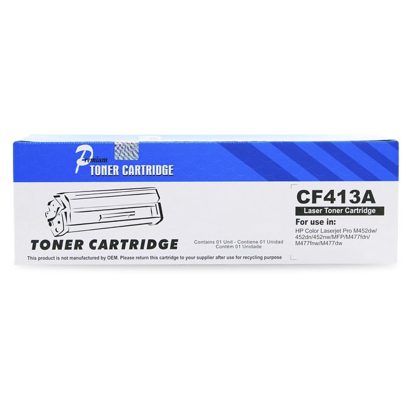 Especificações: Modelo: CF-413A Cor: Magenta Marca: Premium Possui rendimento médio de 2.300 impressões para 5% da página A4 Produto 100% Novo, embalado e lacrado. Utilizado nas impressoras abaixo: Impressora Laserjet Pro M452DN Impressora Laserjet Pro M452NW Impressora Laserjet Pro M452DW Impressora Multifuncional Laserjet Pro M477FNW Impressora Multifuncional Laserjet Pro M477FDW Impressora Multifuncional Laserjet Pro M477FDN