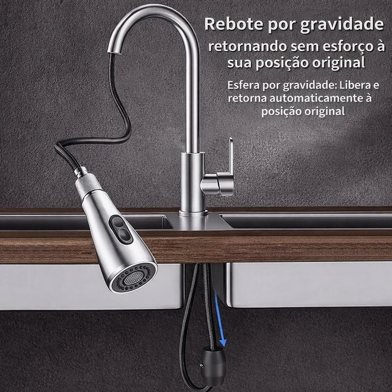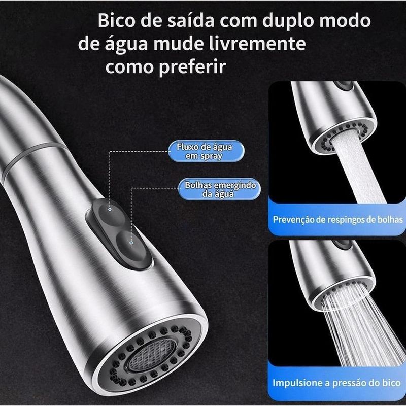 Torneira Goumert Flexivel Prateada Misturador Monocomando Extensivel Cozinha Bancada Pia Quente Fria 2 Jatos Mangueira RTorneira Gourmet Monocomando com Ducha Extensível – Inox FoscoA Torneira Gourmet Monocomando de Bancada é a escolha ideal para quem busca sofisticação, praticidade e alto desempenho na cozinha ou churrasqueira. Com acabamento inox fosco, design moderno e ducha extensível, ela oferece conforto, eficiência e valorização do ambiente.Fabricada em metal de alta qualidade, com cartucho cerâmico de alta performance (500.000 ciclos), garante durabilidade, vedação perfeita e controle preciso da vazão e temperatura da água.Principais Diferenciais:Misturador monocomando: controla água quente e fria com uma única alavancaBica alta com 2 funções: jato contínuo e duchaDucha extensível até 80cm: mais alcance e praticidadeAcabamento prata fosco: moderno, elegante e resistenteCartucho cerâmico: alta durabilidade e vedação eficienteAlavanca leve e ergonômicaCompatível com aquecedorEspecificações Técnicas:Material: Liga de cobre (bronze e latão), aço inox e ABSAcabamento: Prata FoscoBitola: 1/2Altura: 40 cmLargura: 20 cmFuração da bancada: 35 mmTemperatura máxima: até 90°CPressão mínima: 5 mcaPressão máxima: 40 mcaItens Inclusos:1 Torneira Gourmet Monocomando1 Mangueiras flexívelPeças de fixaçãoIndicação de Uso:Ideal para cozinhas residenciais, áreas gourmet e churrasqueiras, oferecendo mais praticidade no dia a dia e valorizando o ambiente com um visual sofisticado.Limpeza:Utilize apenas pano macio e detergente neutro para preservar o acabamento.Torneira Gourmet Monocomando com Ducha Extensível – Inox FoscoA Torneira Gourmet Monocomando de Bancada é a escolha ideal para quem busca sofisticação, praticidade e alto desempenho na cozinha ou churrasqueira. Com acabamento inox fosco, design moderno e ducha extensível, ela oferece conforto, eficiência e valorização do ambiente.Fabricada em metal de alta qualidade, com cartucho cerâmico de alta performance (500.000 ciclos), garante durabilidade, vedação perfeita e controle preciso da vazão e temperatura da água.Principais Diferenciais:Misturador monocomando: controla água quente e fria com uma única alavancaBica alta com 2 funções: jato contínuo e duchaDucha extensível até 80cm: mais alcance e praticidadeAcabamento prata fosco: moderno, elegante e resistenteCartucho cerâmico: alta durabilidade e vedação eficienteAlavanca leve e ergonômicaCompatível com aquecedorEspecificações Técnicas:Material: Liga de cobre (bronze e latão), aço inox e ABSAcabamento: Prata FoscoBitola: 1/2Altura: 40 cmLargura: 20 cmFuração da bancada: 35 mmTemperatura máxima: até 90°CPressão mínima: 5 mcaPressão máxima: 40 mcaItens Inclusos:1 Torneira Gourmet Monocomando1 Mangueiras flexívelPeças de fixaçãoIndicação de Uso:Ideal para cozinhas residenciais, áreas gourmet e churrasqueiras, oferecendo mais praticidade no dia a dia e valorizando o ambiente com um visual sofisticado.Limpeza:Utilize apenas pano macio e detergente neutro para preservar o acabamento.