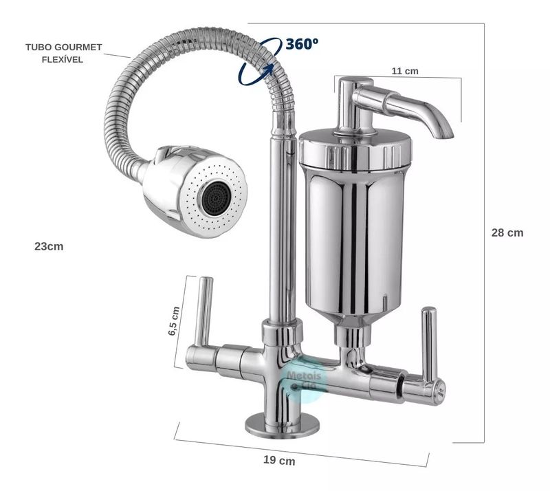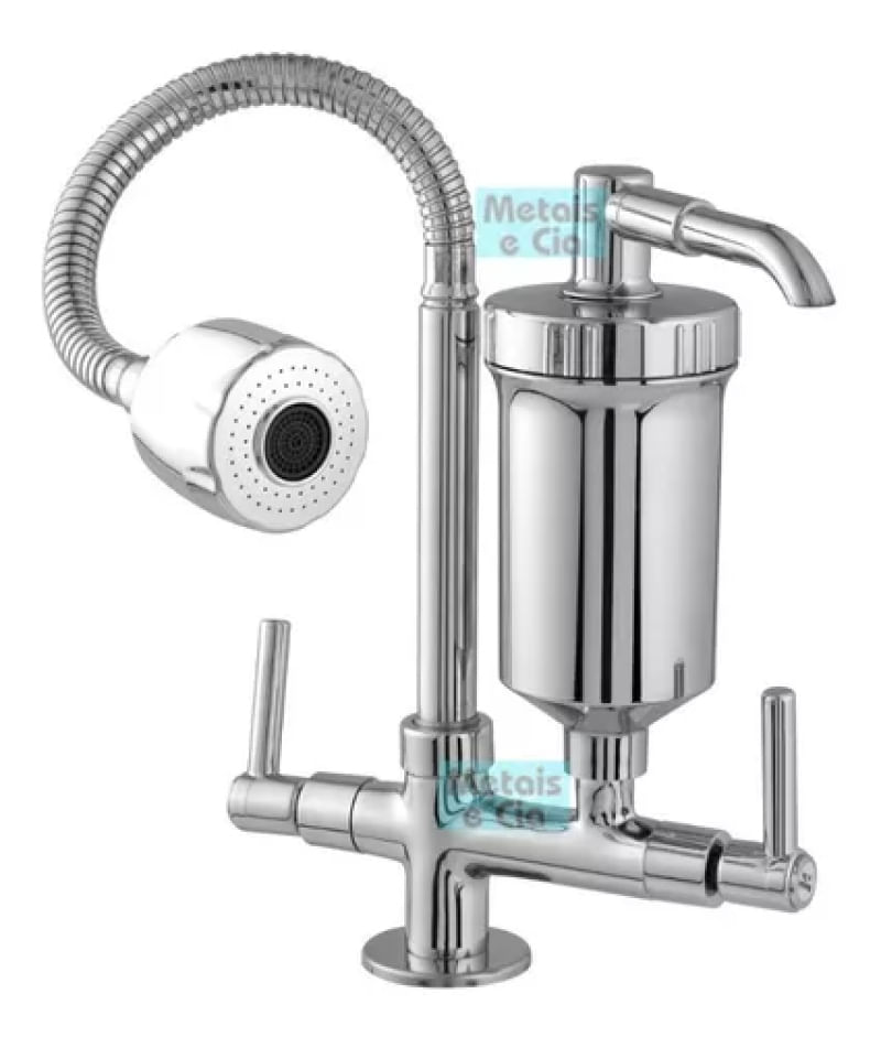 Torneira Metal Com Filtro Cozinha Gourmet Bancada Pia MesaESPECIFICAÇÕES-Produto: 01 Torneira com Filtro Cozinha-Fixação: Bancada -Entrada de Água: 1/2-Acionamento: Metal Cerâmico 1/4 volta-Filtro: Tecnologia moderna Pro-Saúde, garante uma filtragem ainda mais eficiente, Certificado Inmetro.-Tubo: Móvel 360°-Refil: Blindado (Agua não entra em contato com o copo do filtro).-Utilização: Cozinha-Material: Metal Cromado-Copo Filtro e Chuveirinho em ABS-Pressão Mínima: 4 MCA - metros de coluna d'agua para um bom funcionamento-Dimensões: Descritas nas Imagens do anúncio.Garantia:30 dias contra defeitos de fabricação
