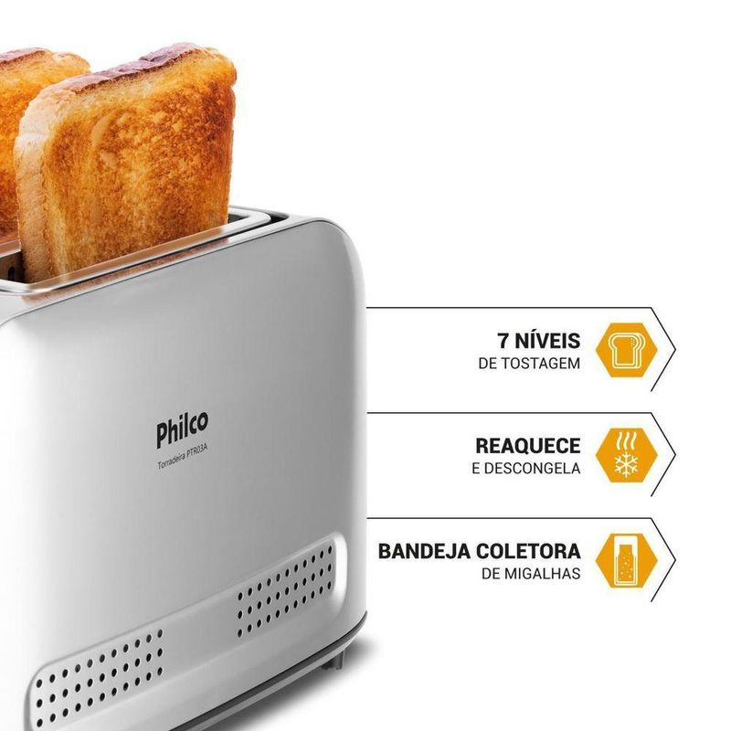 Torradeira Philco 7 Níveis De Tostagem PTR03A 3 Funções 110VDescubra o prazer de começar o dia com pães perfeitamente tostados com a Torradeira Philco PTR03A 3 Funções. Com 7 níveis de tostagem, você tem a liberdade de escolher o ponto ideal para suas torradas, sempre crocantes e douradas ao seu gosto.A torradeira oferece 3 funções essenciais: descongelar, reaquecer e cancelar. Descongele pães congelados, reaqueça torradas e cancele a tostagem a qualquer momento, o que proporciona total controle e praticidade na sua rotina.Com abertura para 2 pães, você prepara duas fatias simultaneamente, agilizando seu café da manhã. Equipada com uma bandeja coletora de migalhas, evita sujeiras na bancada e garante uma cozinha sempre limpa e organizada.O acabamento em inox não só confere elegância, mas também durabilidade à sua torradeira, a combinação ideal com qualquer cozinha.Transforme suas manhãs com a Torradeira Philco PTR03A 3 Funções e sinta a satisfação de ter pães torrados do jeito que você gosta, todos os dias. Com praticidade, segurança e design sofisticado, ela é a escolha perfeita para seu lar!- Função Cancelar- Função Re-aquecer- Função Descongelar- 7 níveis de tostagem- Capacidade para 2 torradas- Pés antiderrapantes- Coletor de migalhas- Acabamento em inox- Porta fio- Composição: Metal e PlásticoEspecificações Técnicas:Marca: PhilcoModelo: PTR03AEstado: NovoPotência (W): 800(W)Quantidade de pães: 2Espessura dos pães: Exemplo: 30mmBandeja de migalhas: SimNíveis de Tostagem: 7Altura do produto: 15,5 cmLargura do produto: 28 cmComprimento do produto: 18 cmPeso do produto: 1,195 kgAltura com embalagem: 19,7 cmLargura com embalagem: 33 cmComprimento com embalagem: 19 cmPeso com embalagem: 1,5 kgGarantia (Dias): 360Observação: Somente faturamos para o nosso consumidor final, ou seja, não faturamos pedidos para CNPJ por este portal de vendas;