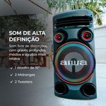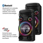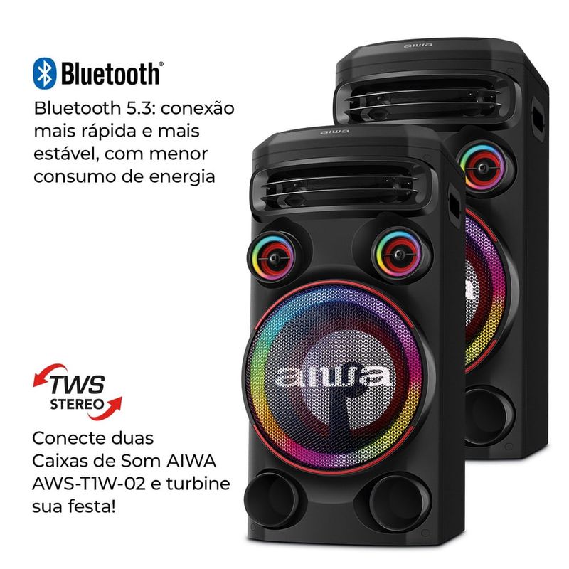 "Som, luz, ação! A Torre de Som AWS-T1W-02 possui 1600W RMS de potência e o som poderoso é garantia de um som estéreo de alta resolução e graves mais profundos, que vão aquecer qualquer pista! Além disso, as funções Dupla Luz Strobo e o RGB Led Color Lights conferem um cenário de luzes multicoloridas e efeitos luminosos vibrantes que não vão deixar ninguém parado. Saiba mais sobre a Torre de Som AWS-T1W-02 da Aiwa: POTÊNCIA PRECISA: Toda festa animada precisa de um som poderoso. Com a torre de som AWS-T1W-02 você vai ter uma experiência sonora fidedigna e para lá de encorpada. São 1600W de RMS que garantem um som alto, nítido e sem distorções! SOM DE ALTA DEFINIÇÃO: A torre de som é composta por 1 woofer de 10’’, que proporciona uma experiência sonora de alta fidelidade, 2 midranges, com frequências médias incríveis, e 2 tweeters, que trazem sons agudos mais acentuados. DUPLA LUZ STROBO: O ambiente da sua festa terá efeitos luminosos vibrantes e contagiantes. Essa tecnologia vai despertar em qualquer um o desejo de não ficar parado! MULTIPLAS CONEXÕES: A Torre de Som AWS-T1W-02 possui entrada para UBS, além de contar com cabo auxiliar, conector RCA, entrada para 2 microfones e outra para 1 Instrumento musical. CONTROLE PELO APLICATIVO: Baixe o aplicativo da torre de som pela Google Play ou pela Apple Store e controle tudo pelo celular. É qualidade de som somada à praticidade! LUZES E VIBRAÇÃO: O recurso RGB LED COLOR LIGTHS confere um cenário com luzes multicoloridas pulsantes, que alternam entre si e brilham em perfeita harmonia. A FORÇA DO BLUETOOTH 5.3: Imagine uma torre de som com conexão mais rápida e mais estável e, ainda, com menor consumo de energia para parear seu smartphone e ouvir suas músicas preferidas? A Aiwa oferece essa experiência incrível! TWS: DUPLIQUE O SOM: Com a função TWS (True Wireless Sound), você consegue duplicar o som da sua festa! Incrível, né? Basta conectar duas Torres de Som AWS-T1W-02 para ter um som estéreo, que vai te possibilitar sentir as sutilezas de cada ritmo, tornando a experiência sonora mais impressionante. RODAS PARA TRANSPORTE: Mais facilidade na hora de transportar sua torre de som para qualquer lugar. Quem não quer uma praticidade como essa? "