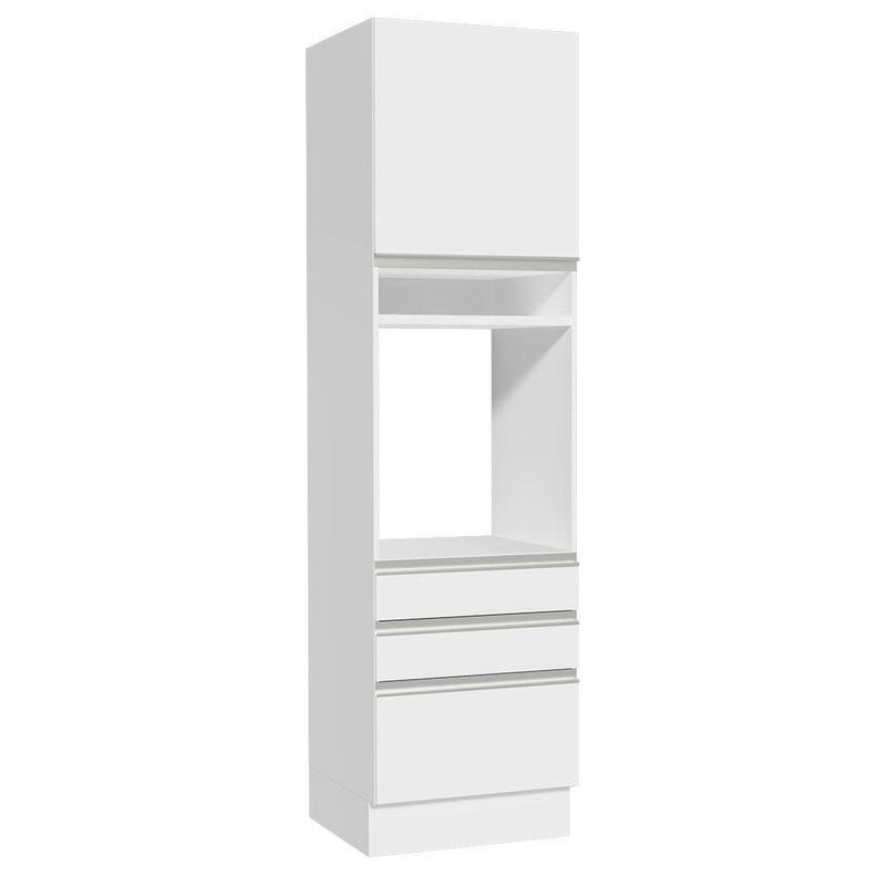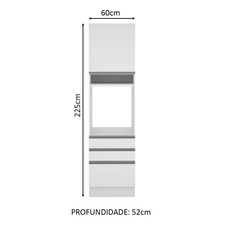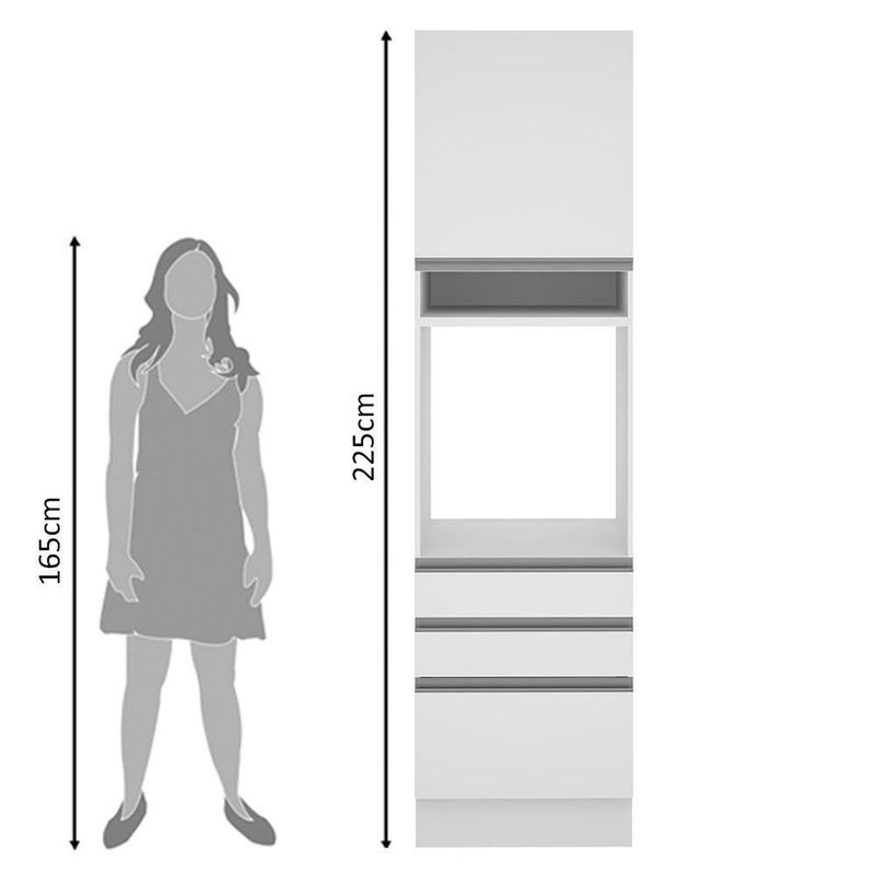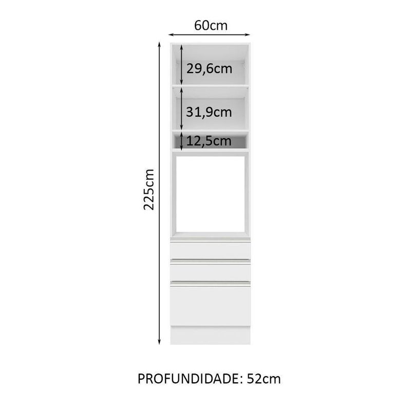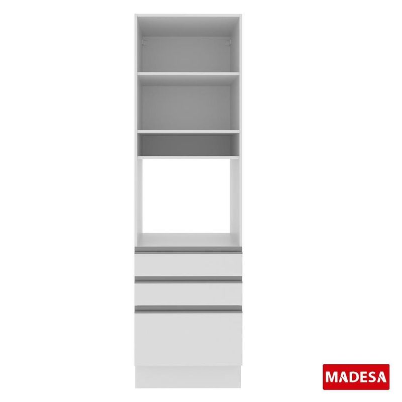 Torre Quente de Forno Glamy 1 Porta 3 Gavetas Branco MadesaProcurando um módulo de cozinha que ofereça praticidade, qualidade e total aproveitamento de espaço?Características:- Este armário conta com 3 gavetas muito espaçosas, sendo uma mais profunda, todas com corrediças telescópicas que possibilitam abertura total das gavetas.- Possui também uma porta convencional que utiliza dobradiças metálicas com amortecimento para o fechamento suave.- Para o bom aproveitamento interno há uma prateleira ideal para armazenar mantimentos.- Além disso, possui um nicho decorativo para deixar itens do dia-adia a mão.- Os pés são em PVC com regulagem de altura e rodapé removível de madeira de fácil encaixe.- Este módulo precisa ser fixado na parede.- O acabamento interno e externo é branco, em Pintura Poliéster com 7 camadas protetoras que aumentam a resistência e durabilidade do móvel.- A pintura é ecológica, isenta de vapores que vão para a atmosfera.- A linha de cozinhas Glamy é totalmente modulada.- É possível combinar este armário com outros módulos disponíveis na linha, inclusive combinando diferentes cores.Especificações Técnicas: - Marca: Madesa- Referência: G2665509GL- Cor: Branco- Estrutura: 1 Porta; 1 Prateleira Interna; 2 Nichos Externos; 3 Gavetas- Dimensões do Produto (LxAxP): 60 cm x 225 cm x 52 cm- Itens Inclusos: 1 Torre Quente- Dimensões da Embalagem (LxAxP): 62 cm x 18,5 cm x 215 cm- Peso da Embalagem: 60,9 kgGarantia: 3 meses