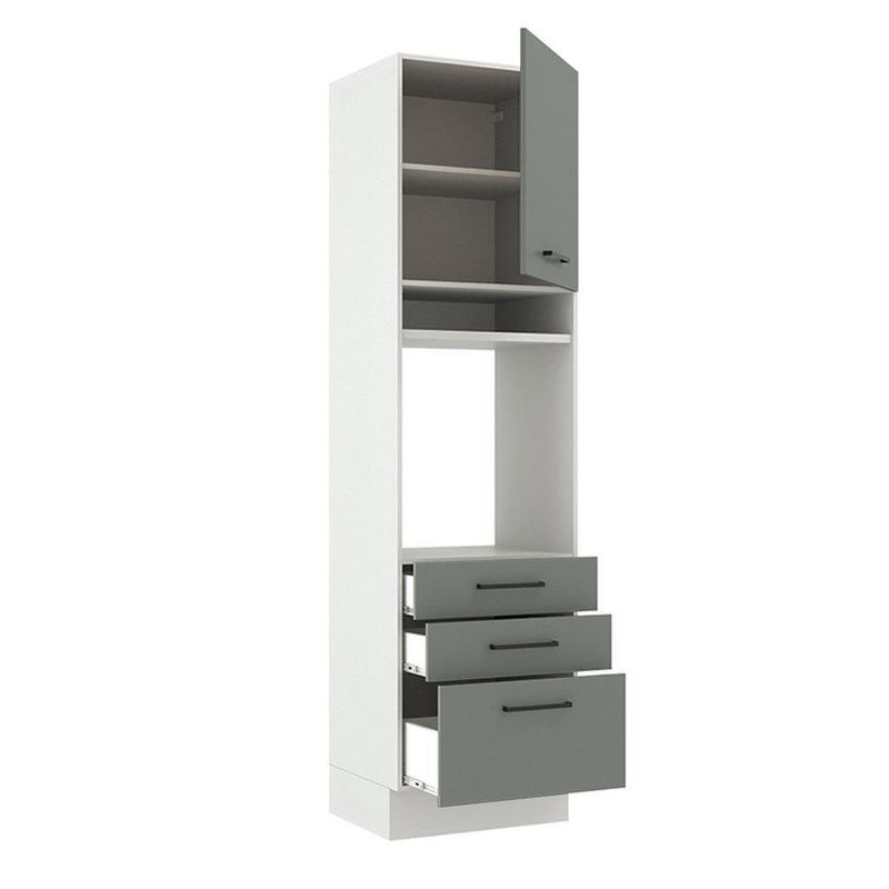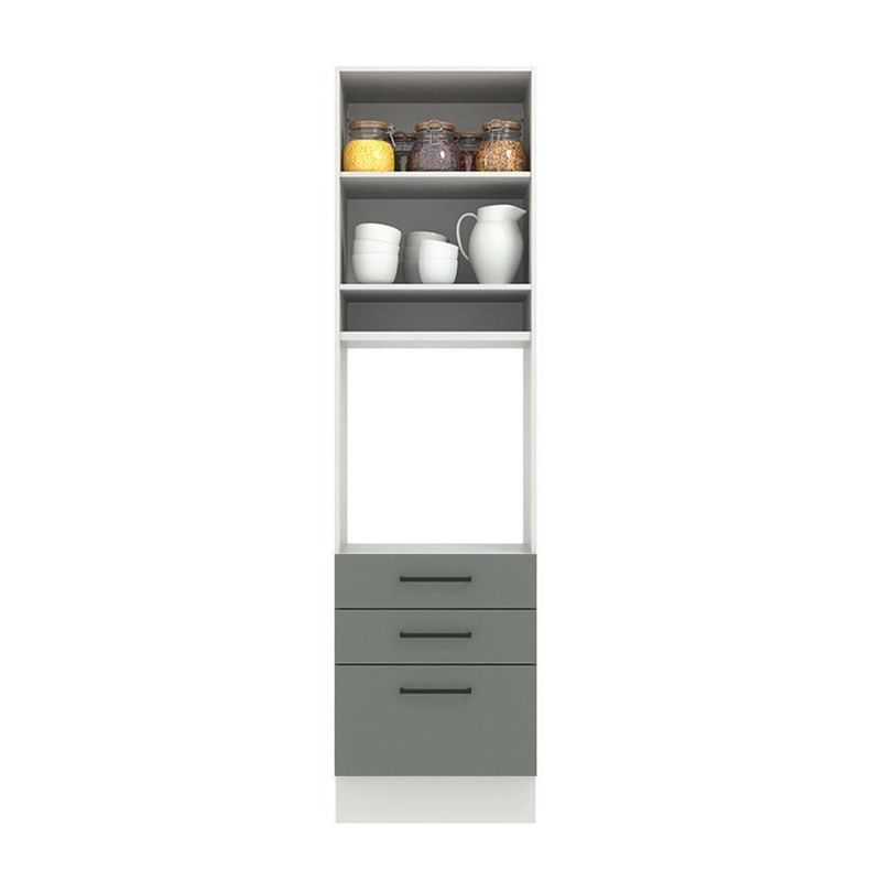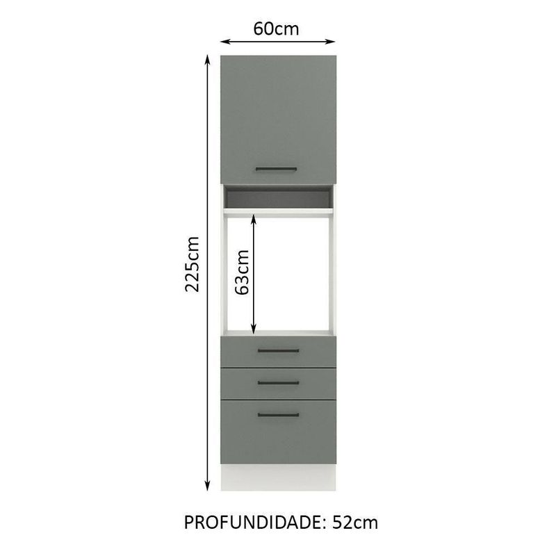 Torre Quente Madesa Agata 1 Porta 3 Gavetas Branco CinzaA Torre Quente de 60 cm da linha de cozinhas Agata da Madesa conta com três gavetas espaçosas, sendo uma mais profunda, todas com corrediças telescópicas que possibilitam abertura total.Possui também uma porta convencional que utiliza dobradiças metálicas com amortecimento para o fechamento suave e a divisão interna é feita por uma prateleira, com ótimo espaço para organizar os utensílios da cozinha.O espaço para forno é de 63 cm x 57 cm com abertura para saída do calor. Permite também a instalação de forno embutido. Além disso possui um nicho decorativo para deixar itens do dia a dia mais a mão. Os pés são em PVC com regulagem de altura e rodapé removível de madeira de fácil encaixe.O acabamento da estrutura é branco e as portas e frentes das gavetas são cinzas. O método utilizado é a Pintura Poliéster ecológica exclusiva da Madesa, processo que aumenta a durabilidade do produto.Esta torre pode ser combinada com outros módulos e com todas as cozinhas da linha Agata.(Imagem meramente ilustrativa. Os eletros e a decoração não acompanham o produto. Este móvel precisa ser fixado na parede.)Especificações técnicas:- Marca: Madesa- Cor: Cinza- Dimensões: Altura 225cm x Largura 60cm x Profundidade 52cm- Produto: Torre Quente- Peso Aproximado: 61 Kg- Material: Mdp- Linha: Agata- Tonalidade: Cinza- Rbn: Casa/móveis/móveis de Cozinha- Material Para Filtro: Mdp- Estado de Origem: Rs- Conteúdo da Embalagem: N/i- Instruções/cuidados: N/i- Garantia: 3 MesesItens inclusos:- Uma (1) Torre quente de 225 cm de altura x 60 cm de largura x 52 cm de profundidade com uma (1) porta, uma (1) prateleira interna, dois (2) nichos externos e três (3) gavetas.