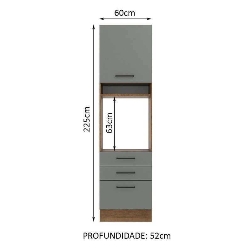 Torre Quente Madesa Agata 1 Porta 3 Gavetas Rustic CinzaA Torre Quente de 60 cm da linha de cozinhas Agata da Madesa conta com três gavetas espaçosas, sendo uma mais profunda, todas com corrediças telescópicas que possibilitam abertura total.Possui também uma porta convencional que utiliza dobradiças metálicas com amortecimento para o fechamento suave e a divisão interna é feita por uma prateleira, com ótimo espaço para organizar os utensílios da cozinha.O espaço para forno é de 63 cm x 57 cm com abertura para saída do calor. Permite também a instalação de forno embutido. Além disso possui um nicho decorativo para deixar itens do dia a dia mais a mão. Os pés são em PVC com regulagem de altura e rodapé removível de madeira de fácil encaixe.O acabamento da estrutura é em amadeirado Rustic, as partes internas das costas e das gavetas são brancas e as portas e frentes das gavetas são cinzas. O método utilizado é a Pintura Poliéster ecológica exclusiva da Madesa, processo que aumenta a durabilidade do produto.Esta torre pode ser combinada com outros módulos e com todas as cozinhas da linha Agata.(Imagem meramente ilustrativa. Os eletros e a decoração não acompanham o produto. Este móvel precisa ser fixado na parede.)Especificações técnicas:- Marca: Madesa- Cor: Cinza- Dimensões: Altura 225cm x Largura 60cm x Profundidade 52 cm- Produto: Torre Quente- Peso Aproximado: 61 Kg- Material: Mdp- Linha: Agata- Tonalidade: Cinza- Rbn: Casa/móveis/móveis de Cozinha- Material Para Filtro: Mdp- Estado de Origem: Rs- Conteúdo da Embalagem: N/i- Instruções/cuidados: N/i- Garantia: 3 MesesItens inclusos:- Uma (1) Torre quente de 225 cm de altura x 60 cm de largura x 52 cm de profundidade com uma (1) porta, uma (1) prateleira interna, dois (2) nichos externos e três (3) gavetas.