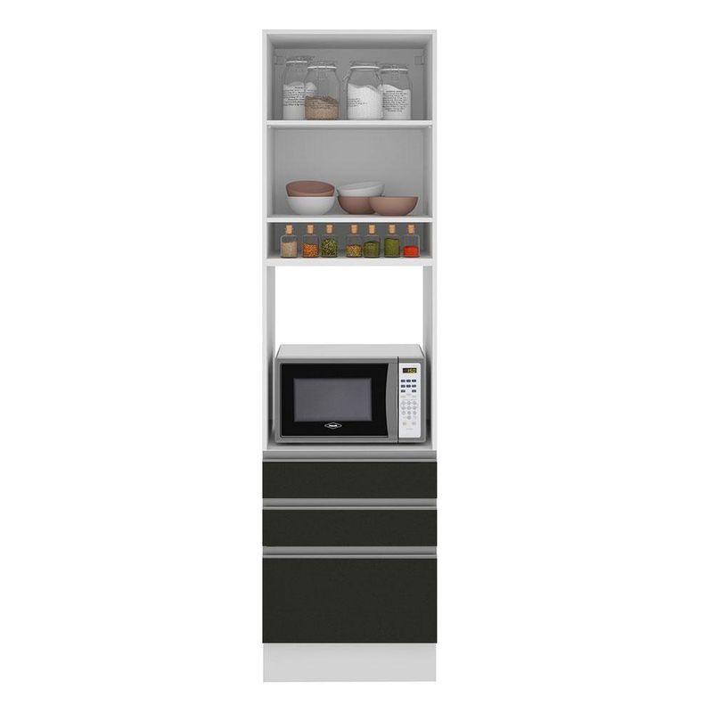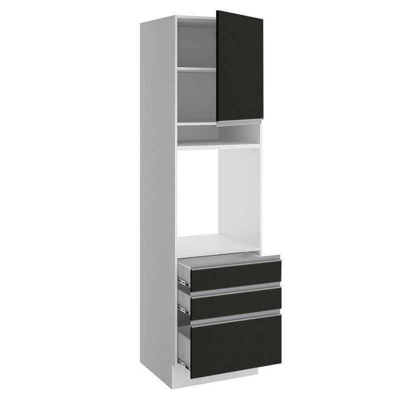 Torre Quente Madesa Glamy 60 Cm 1 Porta 3 Gavetas Branco PretoA Torre Quente Madesa Glamy de 60 cm conta com 3 gavetas muito espaçosas, sendo uma mais profunda, todas com corrediças telescópicas que possibilita abertura total das gavetas.Possui também uma porta convencional que utiliza dobradiças metálicas com amortecimento para o fechamento suave e para o bom aproveitamento interno há uma prateleira ideal para armazenamento de mantimentos.Sua altura é de armário planejado com 225 cm de altura e espaço para forno de 63 cm x 57 cm com abertura para saída do calor. Além disso possui um nicho decorativo para deixar itens do dia a dia mais a mão. Os pés são em PVC com regulagem de altura e rodapé removível de madeira de fácil encaixe. Este módulo precisa ser fixado na parede.O acabamento interno e externo é branco e a porta e as frentes das gavetas são pretas. O processo é feito em Pintura Poliéster de alta resistência, que aumenta a qualidade e a durabilidade do móvel.Esta torre pode ser combinada com outros módulos e com todas as cozinhas da linha Glamy da Madesa, entre elas: Vicenza, Safira e Marina.Imagens meramente ilustrativas. Os eletros e a decoração não acompanham o produto.Especificações técnicas:- Marca: Madesa- Cor: Preto- Dimensões: Altura 225cm x Largura 60cm x Profundidade 52cm- Produto: Torre-quente- Peso Aproximado: 60 Kg- Material: Mdp- Linha: Glamy- Tonalidade: Preto- Rbn: Casa/móveis/móveis de Cozinha- Estado de Origem: Rs- Material Para Filtro: Mdp- Conteúdo da Embalagem: N/i- Instruções/cuidados: N/i- Garantia: 3 MesesItens inclusos:- Uma (1) torre quente de 225 cm de altura x 60 cm de largura x 52 cm de profundidade com uma (1) porta, uma (1) prateleira interna, dois (2) nichos externos e três (3) gavetas.