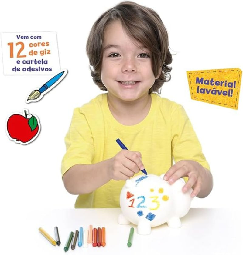 Toyster - Meu Primeiro Cofrinho - Coré - Um incrível cofrinho em formato de porquinho para a criança estilizar como ela quiser! Ele é lavável e pode ser colorido várias vezes! Características Gerais do Produto: • Faixa Etária: 1 a 5 anos de idade • Faixa Etária: +4 • Marca: Toyster • Material: Vinil Acompanha o produto: • 1 Cofrinho. 12 giz de cera. Cartela de adesivos. Garantia: • 7 dias de garantia