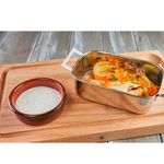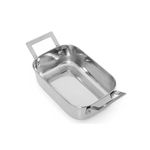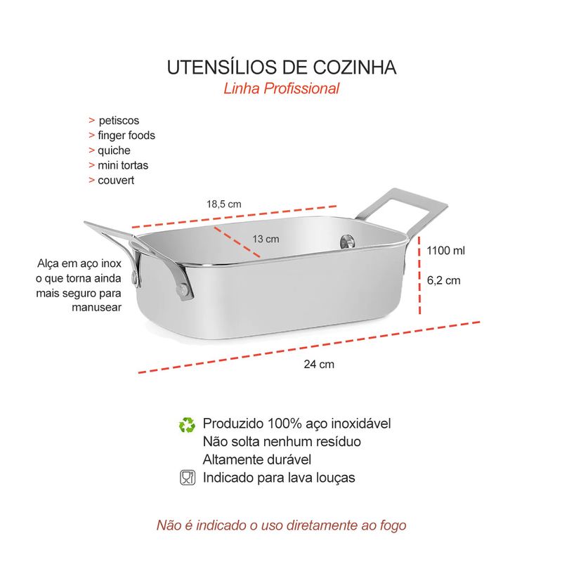 Travessa Courvet é pequena e perfeita para servir aperitivos, mini tortas, finger foods e pratos gourmet. As mini travessas sao versateis, podem ser utilizadas para misturar, auxiliar no preparo e servir. Elas sao perfeitas para buffet, restaurante e bistro. As mini travessas sao produzidas em aço inox 201 super resistente e duraveis. Contem: 1 Mini Travessa Capacidade: 1100 ml Medidas: 24 x 13 x 6,2 cm Material: Aço Inoxidavel Peso: 218 gramas Obs: Não é indicado o uso diretamente ao fogo.