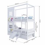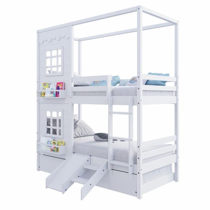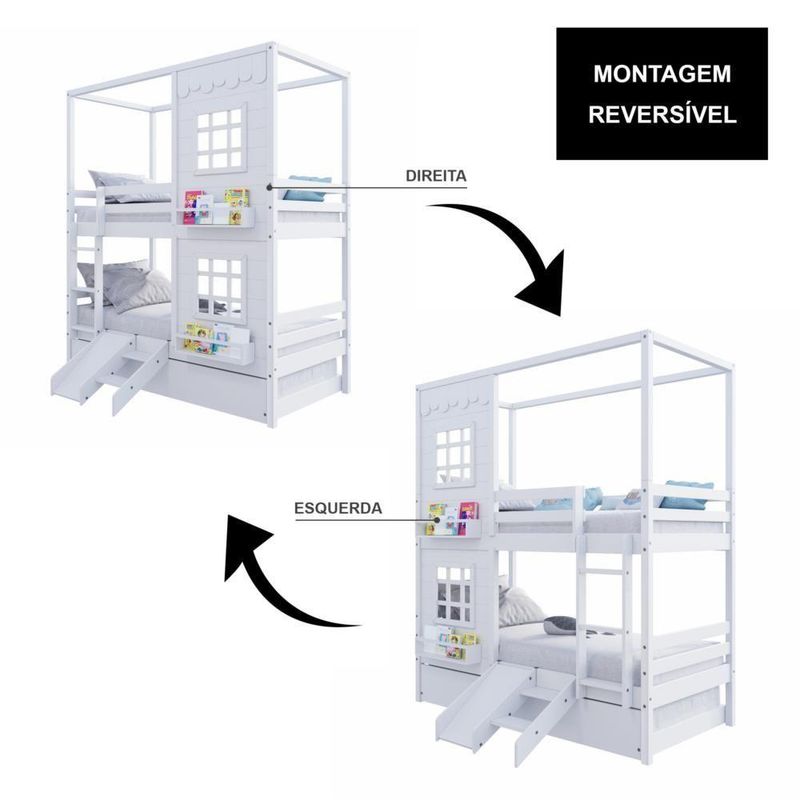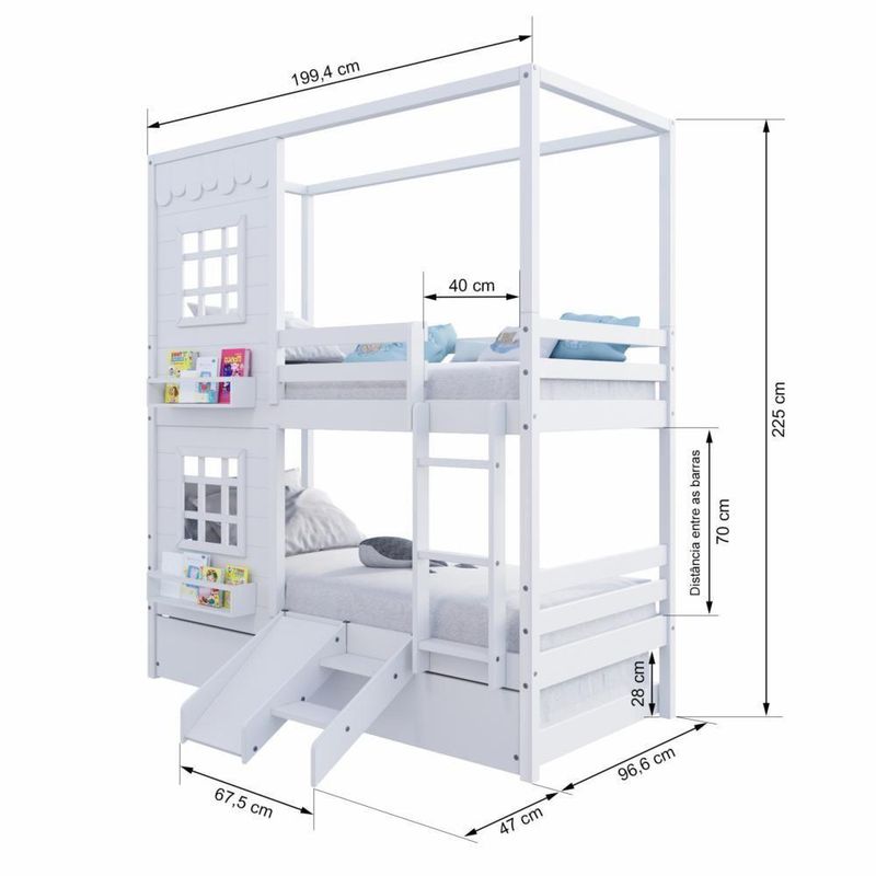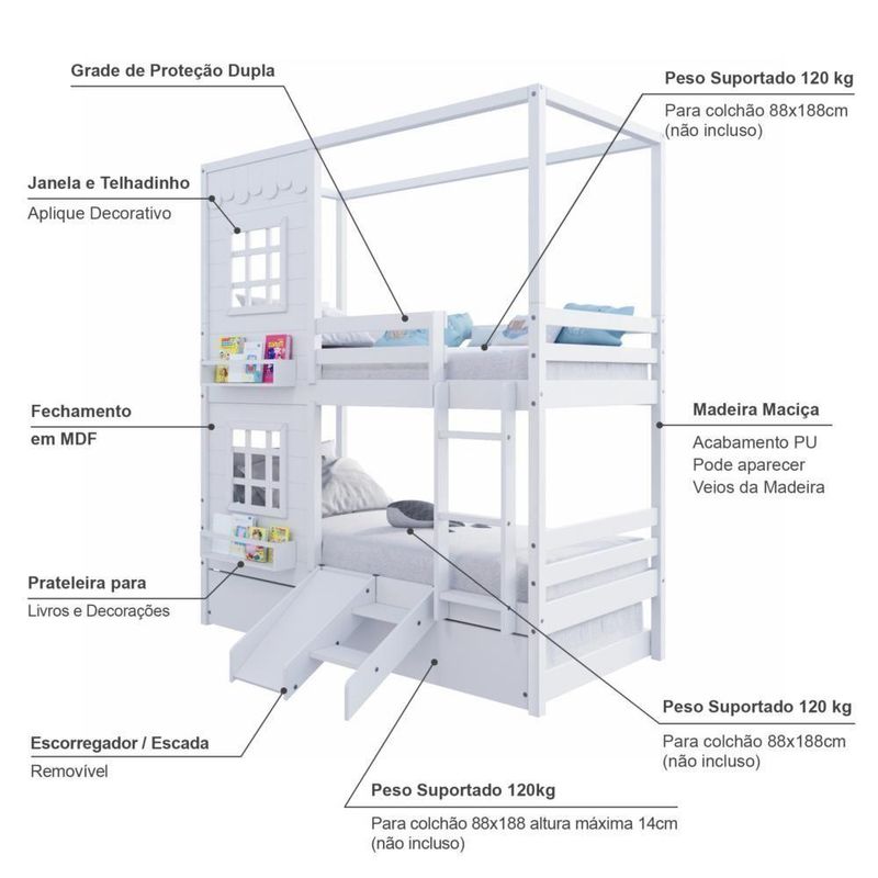 Treliche Casinha Reta Com 02 Janelas E Escorregador Madeira Maciça Branco HousinDETALHESAcabamento: Branco PU (pode mostrar veios da madeira)Estrutura: Madeira Maciça de Pinus de ReflorestamentoMedidas dos Colchões de Solteiro (cm x cm): 88x188 (Não Incluso)Medidas do Colchão da Cama Auxiliar (cm x cm): 88x188 e Altura Máxima 14 (Não Incluso)Peso Suportado Cama de Solteiro: 120 KgPeso Suportado Cama de Auxiliar: 120 KgDiferenciais: Escada Fixa, Auxiliar com 4 Rodízios, Kit Escada/ Escorregador, Casinha com fechamento em MDF, 02 Janelas e Prateleira para Livros e Decoração, Montagem Reversível (Lado Direito ou Lado Esquerdo)DIMENSÕES DO BELICHE MONTADOAltura (cm):225Largura (cm):199,4Profundidade (cm):96,6DIMENSÕES DA CAMA AUXILIARLargura (cm):189Altura (cm):26Profundidade (cm):94INFORMAÇÕES COMPLEMENTARESGarantia do Fabricante: Prazo de 3 meses por defeito de fabricaçãoNecessita de Montagem: SIM (Acompanha manual de montagem)Atenção: Não realizamos serviço de montagem e instalação. Imagens meramente ilustrativas. Cores e tonalidades podem variar.EMBALAGEMPeso (KG):92Quantidade de Volumes:07 Material Principal: Madeira Maciça | Cor: Branco | Necessita Montagem: Sim | Acompanha Colchão: Não | Tipo de Cama: Treliche