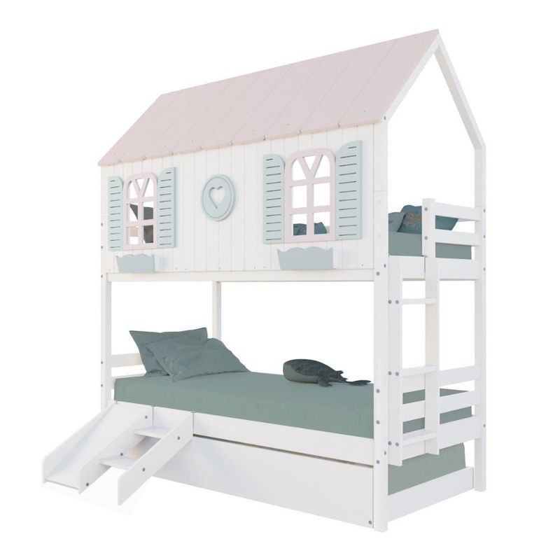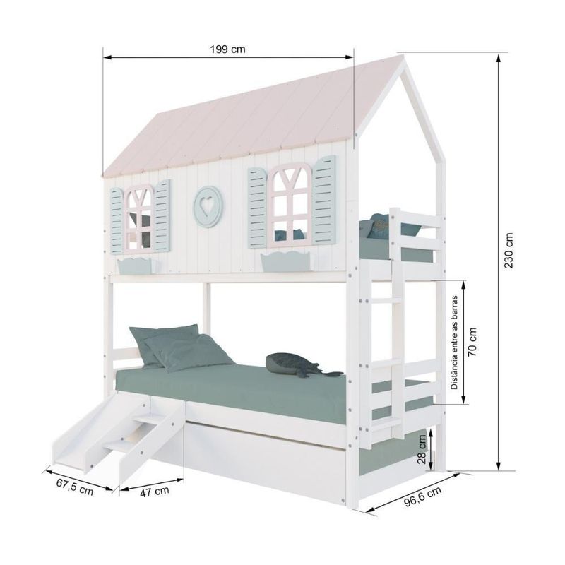 Treliche Casinha Bela Com Coração Kit Escada/escorregador - Madeira Maciça Branco/rosa/verde | HousinDETALHESAcabamento: Branco/Rosa/Verde PU (pode mostrar veios da madeira)Estrutura: Madeira Maciça de Pinus de ReflorestamentoMedidas dos Colchões da Cama de Solteiro (cm x cm): 88x188 (Não Incluso)Medidas do Colchão da Cama Auxiliar (cm x cm): 88x188 e Altura Máxima 14 (Não Incluso)Pesodo Cama de Solteiro: 120 KgPeso Suportado Cama de Auxiliar: 120 KgDiferenciais: Auxiliar com Rodízios, Casinha e Telhado com fechamento em MDF, Fechamento Coração, Janela e Cachepô, Kit Escada/Escorregador.DIMENSÕES DO BELICHE MONTADOAltura (cm): 230Largura (cm): 199Profundidade (cm): 96,6DIMENSÕES DA CAMA AUXILIARLargura (cm): 189Altura (cm): 26Profundidade (cm): 94INFORMAÇÕES COMPLEMENTARESGarantia do Fabricante: Prazo de 3 meses por entrega de fabricaçãoNecessita de montagem: SIM (Acompanha manual de montagem)Atenção: Não realizamos serviço de montagem e instalação. Imagens meramente ilustrativas. Cores e tonalidades podem variar.EMBALAGEMPeso (KG): 113Quantidade de Volumes: 07Material Principal: Madeira | Cor: Branco | Rosa | Verde | Necessita Montagem: Sim | Acompanha Colchão: Não | Tipo de Cama: Treliche Solteiro Casinha