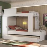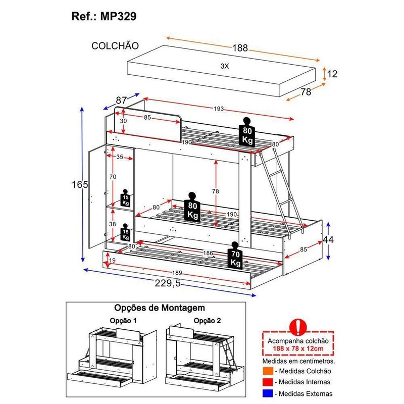 Produzido em MDP com pintura UV acetinada, o Treliche com Colchão Incluso e Barra de Proteção Multimóveis garante durabilidade e resistência. Suportando até 80kg nas camas principais e 70kg na cama auxiliar, possui barra de proteção na cama superior para evitar quedas, além de uma porta lateral com prateleira interna, que oferece amplo espaço para organizar pertences. A escada metálica em ângulo facilita o acesso à cama superior, tornando sua utilização prática e segura. Versátil, pode ser montado dos dois lados - esquerdo ou direito. Para acrescentar conforto, acompanha colchão D23 com tratamento antiácaro e antialérgico, proporcionando noites de sono mais tranquilas e saudáveis.Conteúdo da Embalagem:1 (um) Treliche3 (três) ColchõesManual de MontagemKit FerragemDimensões do produto montado:Treliche - Altura: 165cm | Largura: 229,5cm | Profundidade: 87cmColchão: Altura: 12cm | Largura: 188cm | Profundidade: 78cm*Você pode consultar as medidas detalhadas na imagem técnica do produto.*Obrigatório fixar o treliche na parede.*As cores do produto podem sofrer variações de tonalidade de acordo com as configurações do seu dispositivo.Imagem meramente ilustrativa. Decoração não acompanha o produto.O produto será entregue desmontado e não disponibilizamos o serviço de montagem.