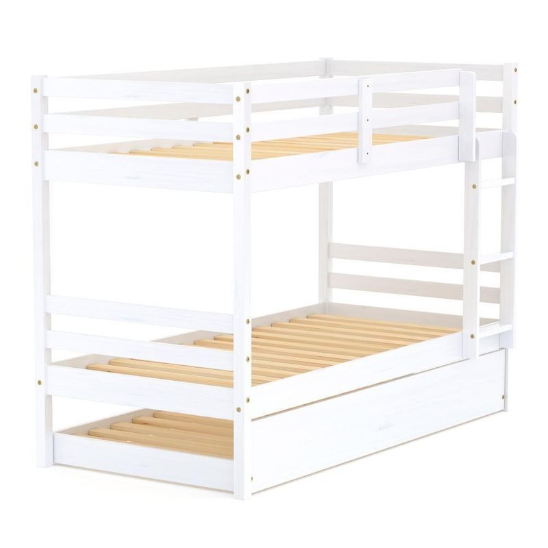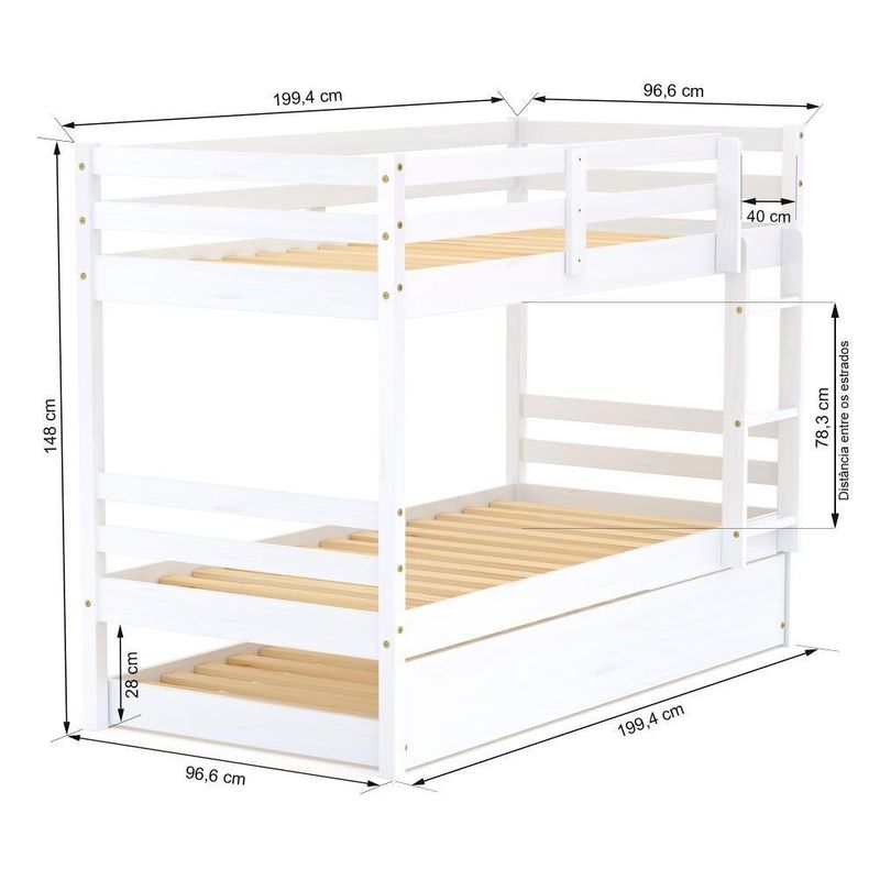 Treliche Infantil Dreams Madeira Maciça Branco MegamobiliaDETALHESAcabamento: Branco UV (pode mostrar veios da madeira)Estrutura: Madeira Maciça de Pinus de ReflorestamentoMedidas dos Colchões da Cama de Solteiro (cm x cm): 188x88 (Não Incluso)Medidas do Colchão da Cama Auxiliar (cm x cm): 188x88 e Altura Máxima 14 (Não Incluso)Peso Suportado Cama de Solteiro: 120 KgPeso Suportado Cama de Auxiliar: 120 KgDiferenciais: Todo em Madeira, Escada Fixa, Grade de Proteção Dupla, Auxiliar com 4 Rodízios.DIMENSÕES DO BELICHE MONTADOAltura (cm):148Largura (cm):199,4Profundidade (cm):96,6DIMENSÕES DA CAMA AUXILIARLargura (cm):189Altura (cm):26Profundidade (cm):94INFORMAÇÕES COMPLEMENTARESGarantia do Fabricante: Prazo de 3 meses por defeito de fabricaçãoNecessita de Montagem: SIM (Acompanha manual de montagem)Atenção: Não realizamos serviço de montagem e instalação. Imagens meramente ilustrativas. Cores e tonalidades podem variar.EMBALAGEMPeso (KG):64Quantidade de Volumes:03 Material Principal: Madeira | Cor Predominante: Branco | Necessita Montagem: Sim | Acompanha Colchão: Não | Tipo de Cama: Treliche | Tamanho da Cama: 88 | Altura: 148 | Largura: 96,6 | Peso máximo suportado: 120 | Peso: 67 | Comprimento: 199 | Cor Via: Branco | Altura com Embalagem: 148 | Largura com Embalagem: 96,6 | Comprimento com Embalagem: 199 | Peso com Embalagem: 67 | Descrição do Tamanho: 148 x 96,6 x 199