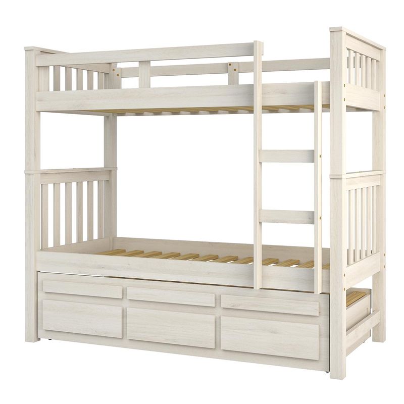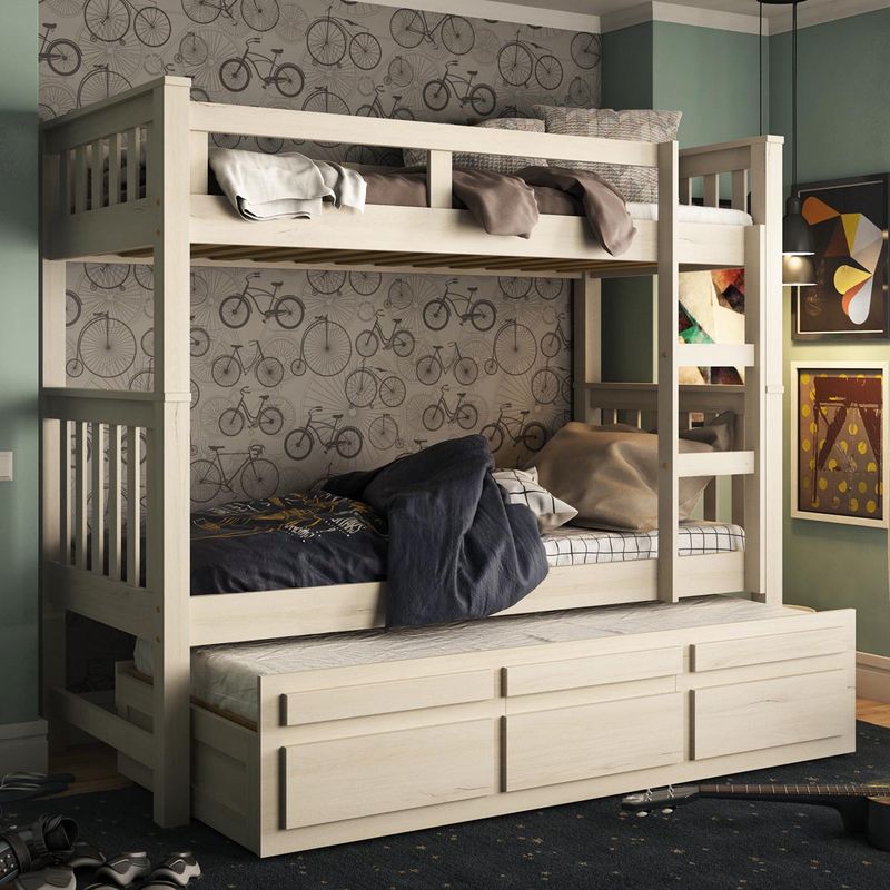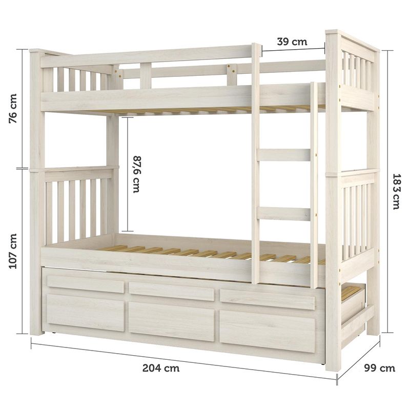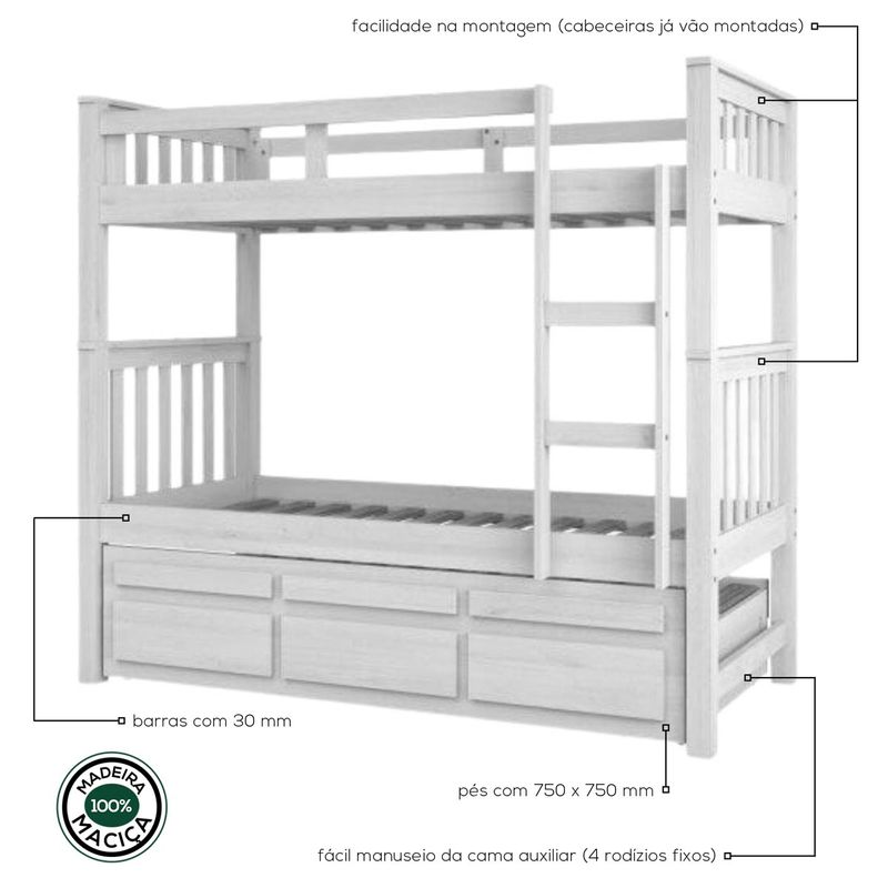 Treliche Solteiro Branco Lavado 3 Gavetas e 1 Escada Madeira de Pinus - Saraiva Essa linda treliche de madeira maciça é ideal para complementa o dormitório da garotada. Possui uma cama auxiliar com rodízios e 3 gavetas com lindos detalhes, proteção lateral na cama superior ajudando na sua segurança e conforto, 1 escada facilitando a sua subida para a cama superior. Aproveite e leve para a sua casa! Especificações Técnicas: Cor: Branco Lavado Escala de Brilho: Fosco Material Principal Estrutura: 100% Madeira Pinus, Fundo compensado 4mm Garantia: 6 Meses garantia fabricante contra defeito de fabricação Conteúdo da Embalagem: 1 Treliche, Kit Ferragem e Manual de Montagem Modelo: 103.04.001 Tamanho Montado: 183 cm x 204 cm x 99 cm - Altura x Largura x Profundidade Tamanho Montado da Cama Auxiliar: 44 cm x 190 cm x 96 cm - Altura x Largura x Profundidade Medida indicada para colchão (L x P): 88 cm x 188 cm Medida indicada para colchão cama auxiliar (L x P): 88 cm x 188 cm com no máximo 14 cm de Produto Montado: Não Necessita Montagem? Sim Complexidade da Montagem: Média: pode ser montado por uma pessoa sozinha Acabamento: Pintura PU verniz Peso: 90 Kg Peso Suportado por Cada Cama: 80 KG cada cama Possui Gavetas: sim, 03 Tipo de Corrediças: Em madeira com deslizante em plástico Tipo de Puxadores: Embutido Possui Proteção na Cama Superior: Sim Possui Escada: Sim Possui Rodízios na Cama Auxiliar: Sim, Fixos Acompanha Cama Auxiliar: Sim Recomendações de Uso, Manutenção e Limpeza: Nunca utilize álcool ou materiais abrasivos para limpeza. Informações importantes: • Fotos meramente ilustrativa. Os objetos que ambientam as fotos não acompanham o produto. • As cores do produto podem variar de acordo com o monitor, a iluminação do ambiente ou sua percepção visual. • A compra do produto não acompanha montagem/desmontagem. • Montagens, desmontagens e instalações são responsabilidades do cliente. Estes serviços não estão inclusos no valor do produto. Para evitar imprevistos na sua entrega, confira as dimensões do produto no momento da compra e certifique-se de que ele passará por elevadores, portas, escadas e corredores, já que nossa entrega não inclui a subida de lances de escada ou o içamento de produtos. • Verifique a complexidade antes de decidir montar sozinho, orientamos que este produto seja montado por um profissional de sua confiança, após a sua entrega. • Todas as instruções, manuais e peças necessárias para a montagem são fornecidos junto com o produto, não nos responsabilizamos pela instalação/montagem. • Fornecemos somente assistências, por defeitos de fábrica.