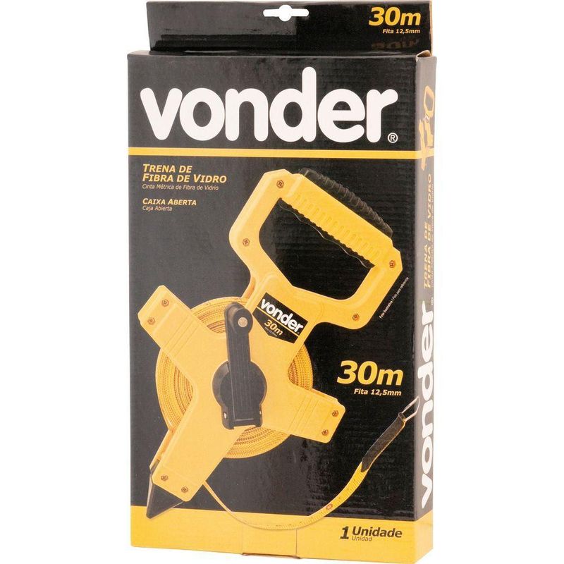 Trena Fibra 30mx12,5mm Longa Aberta VonderConteúdo da embalagem1 TrenaAplicações e dicas de usoIndicada para medições em geralDestaques e diferenciaisCaixa plástica em ABS de alta resistência. Fita em fibra de vidro de alta durabilidade, resistente à Água e variações de temperatura, graduação em mm/pol, manivela para recolhimento da fita, clipe metálico na ponta da fita e cabo ergonômico emborrachado.DETALHES TÉCNICOSComprimento da trena:30 mLargura da fita da trena:12,5 mmTipo da caixa da trena longa:AbertaMaterial da fita da trena longa:Fibra de vidroAcabamento da fita da trena:Pintura foscaClasse de precisão:Classe III Produto: Trena