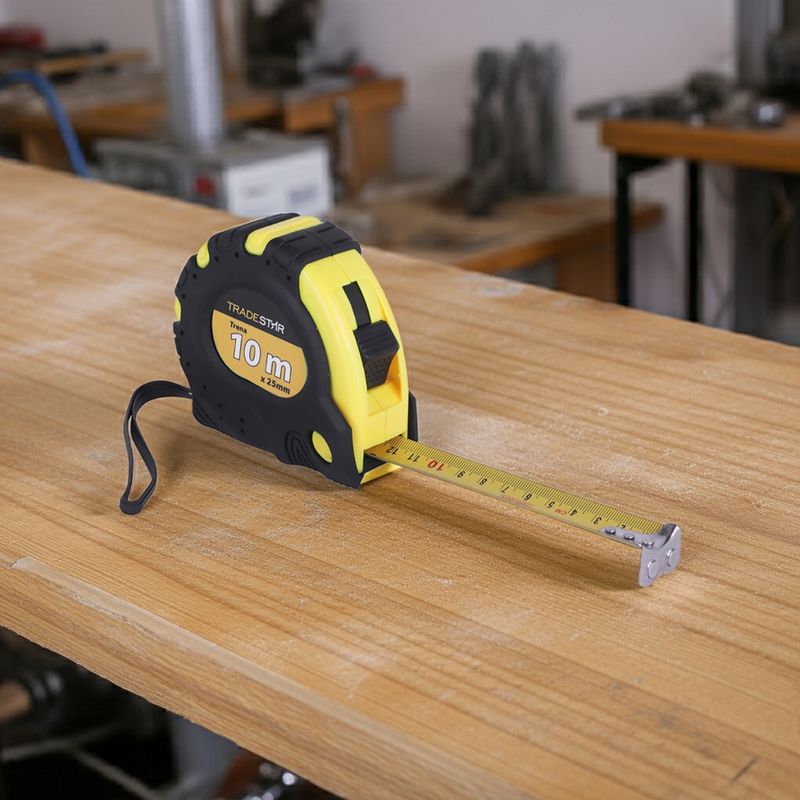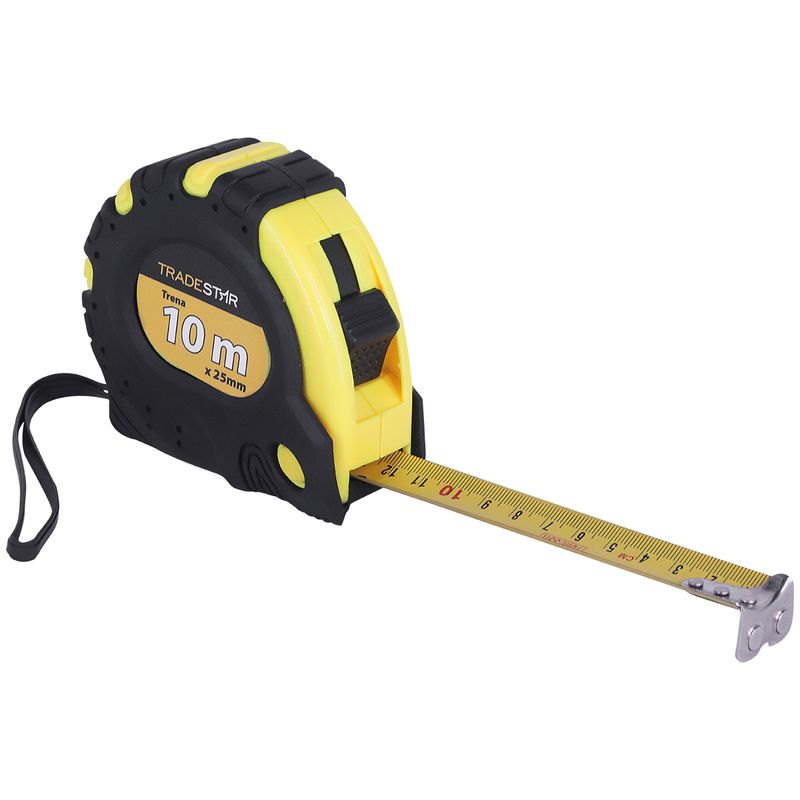 Trena Métrica Tradestar 10 m x 25 mm Emborrachada 3 TravasA Trena Métrica Tradestar é uma ferramenta essencial para profissionais de construção civil, carpintaria, marcenaria e áreas que exigem medições precisas. Seu corpo emborrachado oferece conforto e segurança durante o uso, além de maior resistência a quedas e impactos.Equipada com 3 travas independentes, a trena permite que a fita seja bloqueada em diferentes posições, facilitando medições longas e evitando recuos indesejados. A presilha para cinto garante transporte prático, mantendo a ferramenta sempre à mão durante trabalhos em campo ou na oficina. Durável, confiável e de fácil manuseio, esta trena é indicada para profissionais que buscam precisão, agilidade e praticidade em cada medição.Especificações- Dimensões: 10 m x 25 mm- Número de travas: 3- Corpo emborrachado para maior aderência e resistência- Presilha para cinto para transporte prático- Uso indicado: Construção civil, carpintaria, marcenaria e medições geraisItens inclusos- 1 Trena 10 m x 25 mm Emborrachada 3 TravasGarantia- 03 meses com o Fabricante