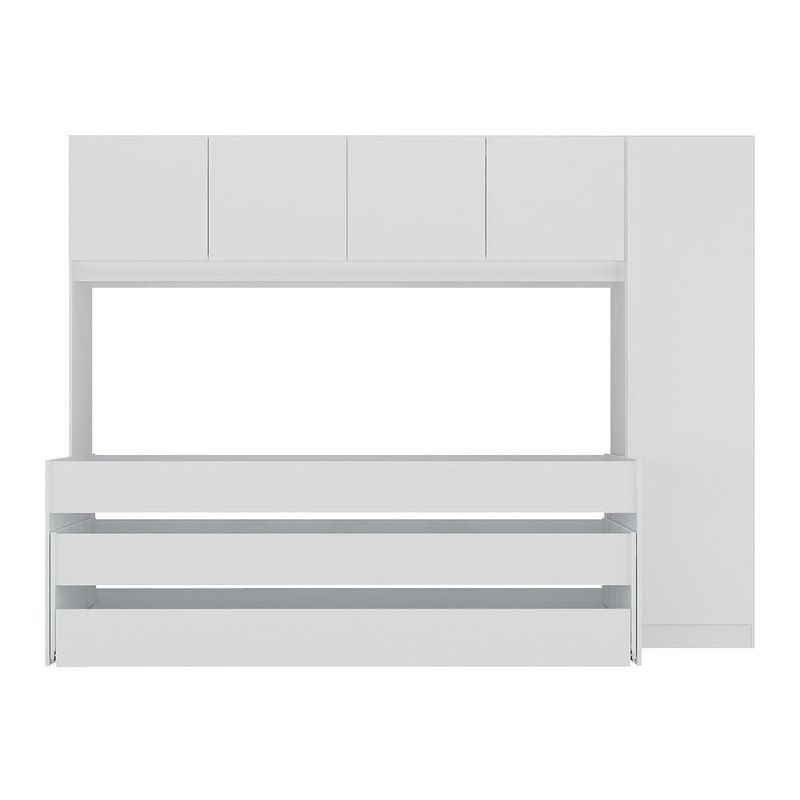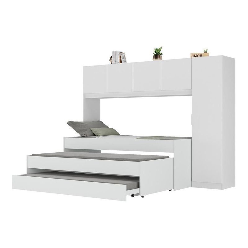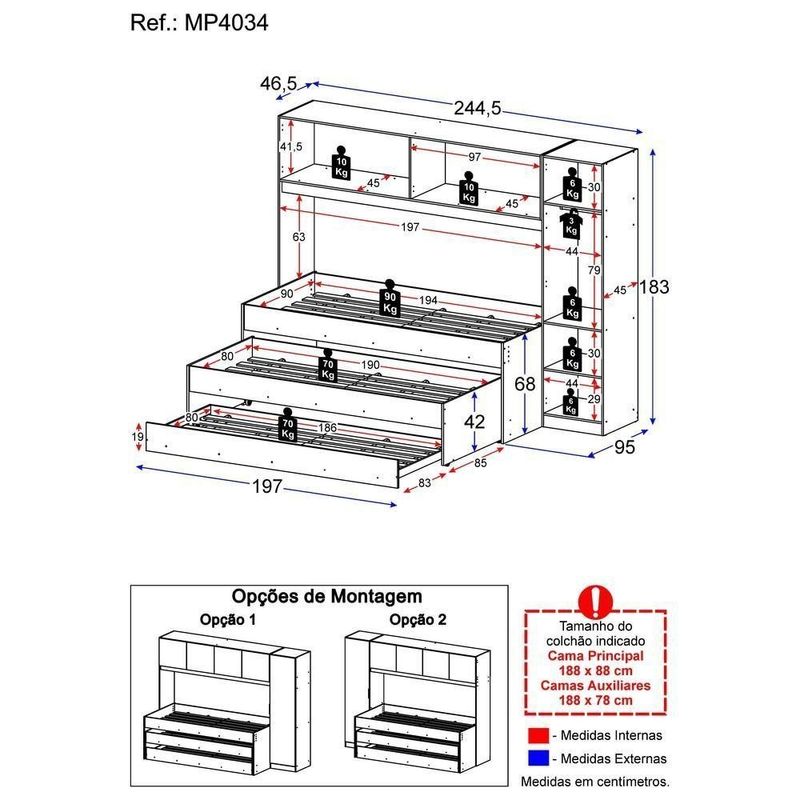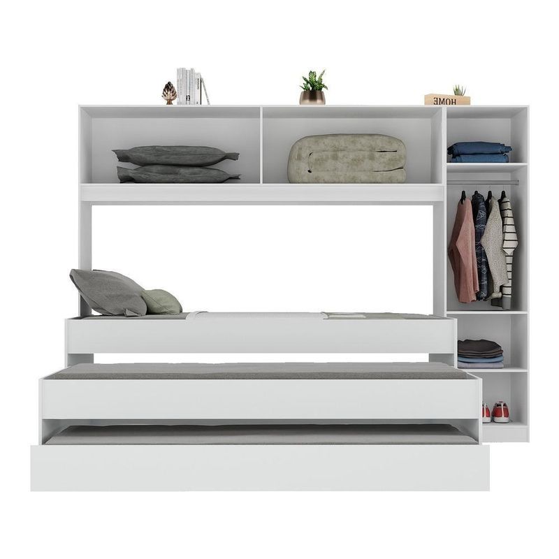 A Tricama de Solteiro com Guarda-Roupas Dublin Multimóveis MP4034 é uma opção com excelente custo-benefício para deixar seu quarto completo. Produzidos em MDP, que garante maior durabilidade e resistência, possuem acabamento acetinado (cerca de 20% de brilho). O guarda-roupas possui 4 portas e 1 porta lateral com puxador em ABS, cabideiro (em madeira) e 3 prateleiras internas, contendo amplo espaço interno organizar roupas e acessórios. Versátil, a porta lateral pode ser montada dos dois lados do guarda-roupas - esquerdo ou direito. A cama de solteiro principal suporta até 90 kg e as auxiliares suportam até 70 kg. NÃO acompanha colchões (tamanho indicado de colchões: Principal: 188 x 88 cm | Auxiliares: 188 x 78 cm).Conteúdo da Embalagem:1 (uma) Tricama1 (um) Guarda-RoupasManual de MontagemKit FerragemDimensões do produto montado:Tricama - Altura: 68cm | Largura: 197cm | Profundidade: 95cmGuarda-Roupas - 183cm | Largura: 244,5cm | Profundidade: 46,5cm*Você pode consultar as medidas internas na imagem técnica do produto.*As cores do produto podem sofrer variações de tonalidade de acordo com as configurações do seu dispositivo.*Obrigatório fixar o guarda-roupas na parede.Imagem meramente ilustrativa. Decoração não acompanha o produto.O produto será entregue desmontado e a Multimóveis não disponibiliza o serviço de montagem.