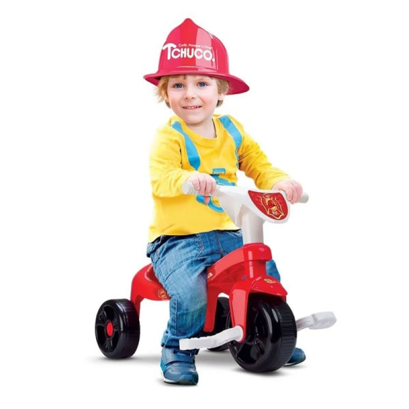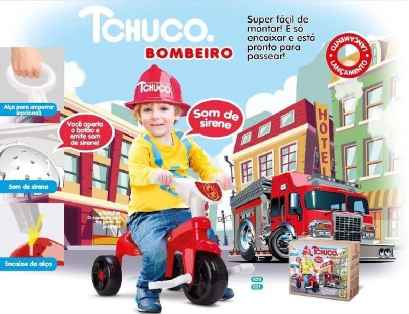 Triciclo Motoca Bombeiro Com Som e Haste Tchuco Samba Toys - TRICICLO BOMBEIRO COM SOM - SAMBA TOYS A criançada vai ser divertir de montão com o triciclo Bombeiro da Samba Toys! Possui dispositivo com som de sirene. Suas cores características e adesivos irados vão chamar a atenção dos pequenos para que se divirtam de montão. Ele ajudará a estimular a criatividade e imaginação da criança. Além de possuir assento anatômico para o conforto do seu filho. ESPECIFICAÇÕES: - Idade Minima recomendada: 3 Anos - Peso Maximo suportado: 20Kg - Com som - Assento Anatômico - Linha: Tchuco - Marca: Samba Toys - Referência: 621 - Certificado de Segurança: INMETRO CE-BRI/BRICS 00275-16 Comprimento: 56,5cm. Largura: 38,5cm. Altura sem haste: 43,0cm. Altura com haste: 84,1cm. Características Gerais do Produto: Garantia: • Garantia do site - 1 Mês