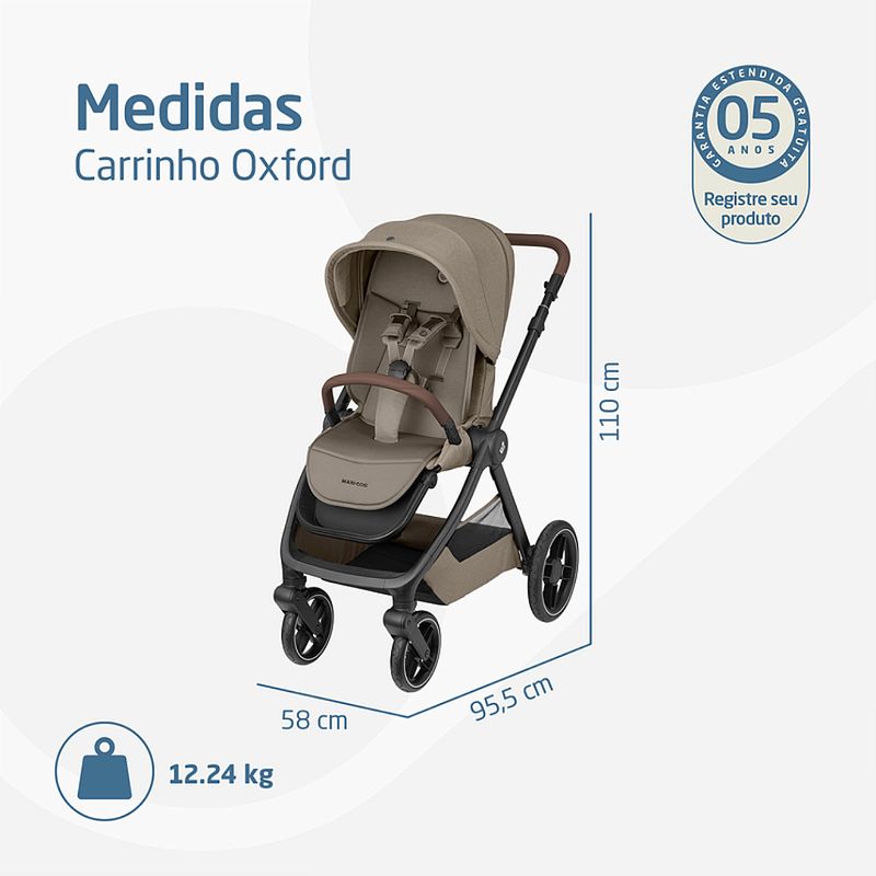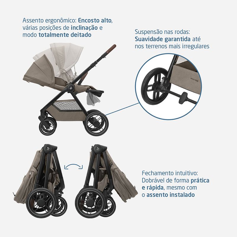 Trio Carrinho de bebê Oxford + Bebê conforto Pebble Pro 360 + Moisés Sense - Twillic Truffle - Maxi Cosi O carrinho Oxford combina design espaçoso e conforto premium, pensado para acompanhar a família desde o primeiro dia até os 22 kg. O Oxford foi projetado para acompanhar as rotinas das famílias com conforto e praticidade desde o nascimento até os 4 anos. Sua estrutura robusta com suspensão nas rodas proporciona passeios suaves mesmo em terrenos irregulares, enquanto o assento reclinável e o encosto alto garantem bem-estar em todas as posições — inclusive deitado, ideal para as sonecas durante os trajetos. O design ergonômico acomoda a criança com segurança e liberdade de movimento em cada fase do crescimento. Para os pais, o Oxford entrega soluções funcionais como o fechamento em 2 passos, cesto com capacidade para de 10 kg com bolso integrado e barra de proteção com revestimento especial. Os tecidos Eco Care, feitos com fibras 100% recicladas, aliam conforto ao toque e consciência ambiental — porque a praticidade também pode ser elegante e responsável. Compatível com moisés Sense e cadeirinhas Maxi-Cosi, vendidos separadamente. Assento espaçoso com encosto alto, proporcionando mais conforto em todas as fases. Reclinação ergonômica, incluindo posição totalmente deitada. Suspensão nas rodas, entregando passeios mais confortáveis até em terrenos irregulares. Fechamento em 2 passos, fácil de dobrar. Cesto de compras com 10 kg de capacidade. Bolso integrado para os pais, organiza e mantém itens à mão. Barra de proteção e manopla com revestimento especial. Tecidos Eco Care 100% reciclados. NORMA ABNT NBR 1438914389-2:2022 Fechamento compacto com assento em qualquer direção Reclinável: 3 posições de inclinação Apoio para os pés: Ajustável em 4 posições Assento reversível Capota extensível FPS 50+ com janela de ventilação transparente e visor Manopla Ajustável em 5 posições de altura Barra frontal com abertura ou removível Cinto de segurança Easy-in de 5 pontos com protetores acolchoados ajustável em altura e largura Cesto: Capacidade para 10 kg e inclui bolso discreto na parte de trás do encosto com capacidade para 0,5 kg Rodas: 4 rodas com amortecedores Freios: Centralizado Trava de direcionamento de rodas: Giro 360° com trava nas rodas dianteiras Amortecedores nas 4 rodas Mosquiteiro: Incluso Material/Composição: Alumínio, Aço, Poliéster, EPE, PA, PE, POM, PP, PU, ABS, EVA Adapta bebê conforto: Compatível com: Citi², Coral 360, Pebble Pro e Pebble 360 Pro² vendidos separadamente Peso do Produto: 12,2 kgs Dimensões Externa do Produto (A x L x P | cm) 110 x 58 x 95,5 Registro: 005736/2025 Bebê Conforto Pebble 360 Pro com Base Twillic Truffle - Maxi Cosi Desde o primeiro dia, o Maxi-Cosi Pebble 360 Pro² prioriza a segurança e o conforto do seu bebê com sua posição totalmente reclinável, proporcionando o máximo conforto para dormir. Compatível com o FamilyFix 360 Pro, combina a tecnologia SlideTech® e rotação de 360° para uma instalação fácil. Segurança intransigente, conforto incomparável, o Pebble 360 Pro² está lá desde o início. Desde o primeiro dia, o Maxi-Cosi Pebble 360 Pro² coloca a segurança e o conforto do seu bebê em primeiro lugar. Sua posição totalmente reclinável é uma verdadeira revolução para os pais que buscam o máximo conforto para dormir para o seu pequeno em todas as viagens, seja acoplado ao seu carrinho ou instalado no seu carro. Como parte da Família 360 Pro, o Pebble 360 Pro² possui rotação de 360° e SlideTech®. Quando usado com a base deslizante rotativa FamilyFix 360 Pro, você pode girar e deslizar seu filho em sua direção sem esforço — colocar e tirar seu filho do carro é o mais fácil que já foi. Sem mais dores nas costas, batidas na cabeça ou lutas. Simplesmente deslize, gire e vá. Projetado com painéis de ventilação ClimaFlow, espuma respirável e tecidos de malha confortáveis para melhor circulação do ar, seu filho pode descansar fácil e confortavelmente no Pebble 360 Pro². O apoio de cabeça ajustável e o inlay para recém-nascidos removível garantem uma respiração ideal enquanto seu bebê está na cadeirinha. Segurança intransigente e conforto incomparável estão no cerne do Pebble 360 Pro², acompanhando a jornada do seu bebê desde o nascimento até aproximadamente 18 meses (40 cm até 87 cm). Se o seu pequeno chegar um pouco antes do esperado, fique tranquilo que o Pebble 360 Pro² pode transportar com segurança bebês prematuros também. Isso proporciona tranquilidade enquanto você embarca nesta emocionante jornada em família. Tecnologia inovadora SlideTech™: Nossa revolucionária tecnologia de cadeirinha de carro deslizante combinada com a rotação de 360° com uma só mão para tornar cada dia mais fácil para os pais. Simplesmente deslize, gire e vá! Posição completamente reclinada: O Pebble 360 Pro² reclina em uma posição completamente reclinada em todos os modos para o máximo conforto de sono – no carro ou acoplado a um carrinho de bebê. ClimaFlow para controle de temperatura: Projetado com painéis de ventilação, espuma respirável e tecidos de malha tecnológica para uma circulação de ar aprimorada, garantindo que seu filho fique confortável. Cinto Easy-in O Pebble 360 Pro² apresenta cinto com Easy-in que fica aberto e na posição perfeita, para que você possa colocar e tirar seu filho do carro sem esforço. Proteção contra impactos laterais GCELL: A proteção contra impactos laterais G-CELL oferece ao seu filho uma segurança inigualável, distribuindo o impacto e reduzindo lesões em caso de colisão. Design ergonômico: O design ergonômico do Pebble 360 Pro² garante que seu bebê mantenha uma postura correta e confortável, apoiando o desenvolvimento saudável da coluna vertebral. Dados técnicos: Grupos Classificação: i-Size: 40 a 87cm (Grupos 0+,1,2 e 3) Instalação: Cintos de 3