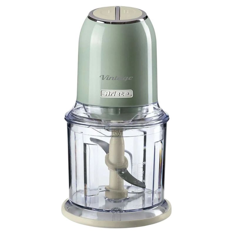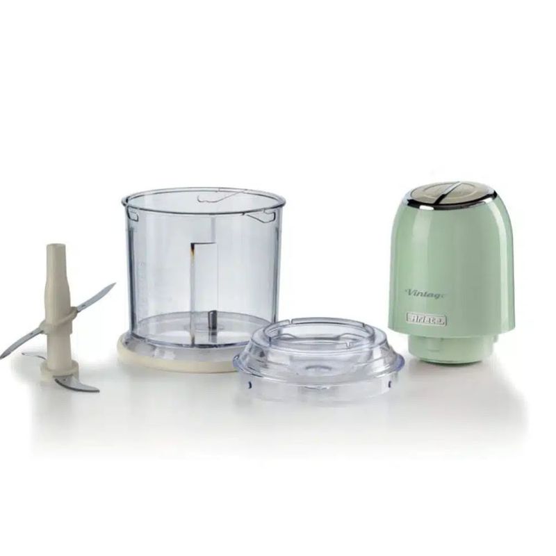 A Linha Vintage da Ariete é enriquecida com um produto essencial para as receitas da sua cozinha: um triturador elétrico com linhas retrô e tons pastéis suaves, perfeito para trazer um toque de estilo e funcionalidade para a sua cozinha. Graças à sua potência de 250 Watts e 4 lâminas de aço inoxidável, o Triturador Vintage permite cortar qualquer ingrediente para as suas receitas: desde legumes a carne, queijo, pão, fruta seca e até mesmo gelo. As 2 velocidades, que podem ser operadas com os dois botões na parte superior do Triturador, permitem cortar finamente os alimentos, enquanto os pés antiderrapantes garantem segurança e a máxima aderência do produto à superfície de trabalho. TRITURAR LEGUMES PARA UMA PICANHA PERFEITANão há ragù (ensopado) caseiro sem uma boa cebola picada, alho, cenoura e salsa. Com o triturador Vintage você pica todas as ervas e legumes uniformemente em poucos instantes para preparar o refogado para suas receitas mais saborosas. Diga adeus aos temperos prontos! Graças ao triturador, você também pode preparar grandes quantidades de carne prontas para serem congeladas em porções convenientes para serem usadas sempre que preferir. FUNÇÃO DE TRITURADOR DE GELO PARA COQUETÉIS E RASPADINHASAs lâminas de aço inoxidável e a potência do Triturador Vintage permitem picar finamente qualquer ingrediente, incluindo gelo. Na verdade, o triturador também é um conveniente triturador de gelo: divirta-se preparando todos os tipos de raspadinhas em casa ou delicie-se com coquetéis frescos e que matam a sede, para dar um toque de alegria às suas noites em casa. - Destaques: • Fácil de usar• 4 lâminas de aço inoxidável• 600ml de capacidade• Função triturador de gelo• Pés antiderrapantes - Especificações: • Modelo: 438• Cor: Verde• Voltagem: 127V• Potência: 250W (127V)• Capacidade do copo: 600 ml• Largura: 12,50cm• Altura: 26,00• Comprimento: 12cm• Lâminas: 4 lâminas aço inox• Velocidade: 2 velocidades com 2 botões• Pés antiderrapantes + anel: Sim