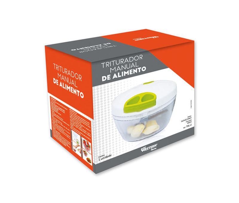 Triturador Manual de Alimentos Western - WeConnectPara uma cozinha mais prática e eficienteDiferenciais do Produto:Lâminas duplas em aço inox para triturar diversos tipos de alimentos.Fácil utilização e limpeza.Compacto e fácil de armazenar.Mais sobre o Produto:O Triturador Manual de Alimentos Western é versátil e pode ser utilizado para triturar, moer e picar alimentos de forma eficiente. Evite cortar produtos congelados ou cubos de gelo, pois não são indicados para esse uso. Recomenda-se lavar com sabão neutro e esponja macia, evitando produtos abrasivos. Para manter o produto sempre em boas condições, é importante seguir as instruções de uso e conservação fornecidas.Dicas de Uso:Para resultados ideais, encha o triturador com no máximo um quarto de sua capacidade.Evite excesso de alimentos para não prejudicar o funcionamento das lâminas.Guarde o produto em lugares estáveis e fora do alcance de crianças.Aproveite a praticidade e eficiência do Triturador Manual de Alimentos Western em sua cozinha e simplifique o preparo de suas refeições diárias.Ficha Técnica:Marca: WesternProduto: Triturador Manual de Alimentos WesternMaterial: Plástico e Aço InoxDimensões da Peça: 12,5 x 12,5 x 9cmDimensões da Embalagem: 13,3 x 10 x 13,3cmGarantia: 90 dias + garantia do fabricante